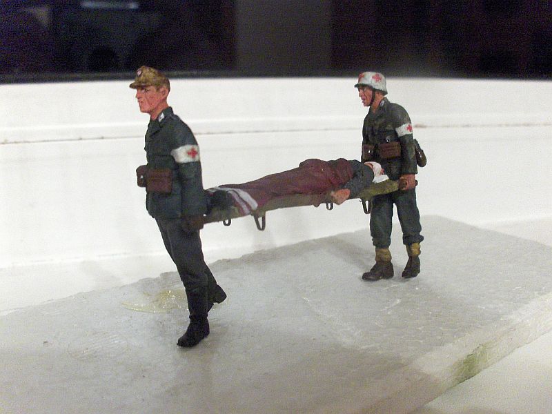 Тут все уже "включено" в смоляных фигурках, так что стачивать повязки я не стал. Думаю, что пиратка "Ягуара" или чего-то вроде. Вообще они изображали эсэсовцев-санитаров, но для моего сюжета электрики не подходили. Но переделка несложна - подрезать петлицы и подточить переразмеренный череп на кепи в немецкий круглый значок Красного креста. А одежда, судя по фото, у Красного креста была из "что было", главное, была бы повязка некомбатанта.