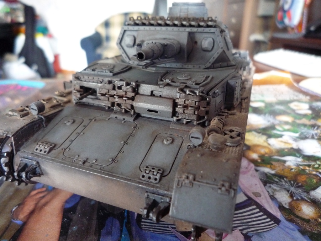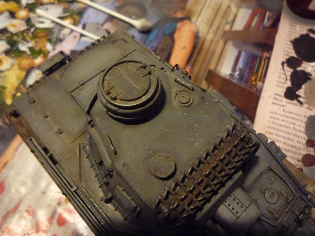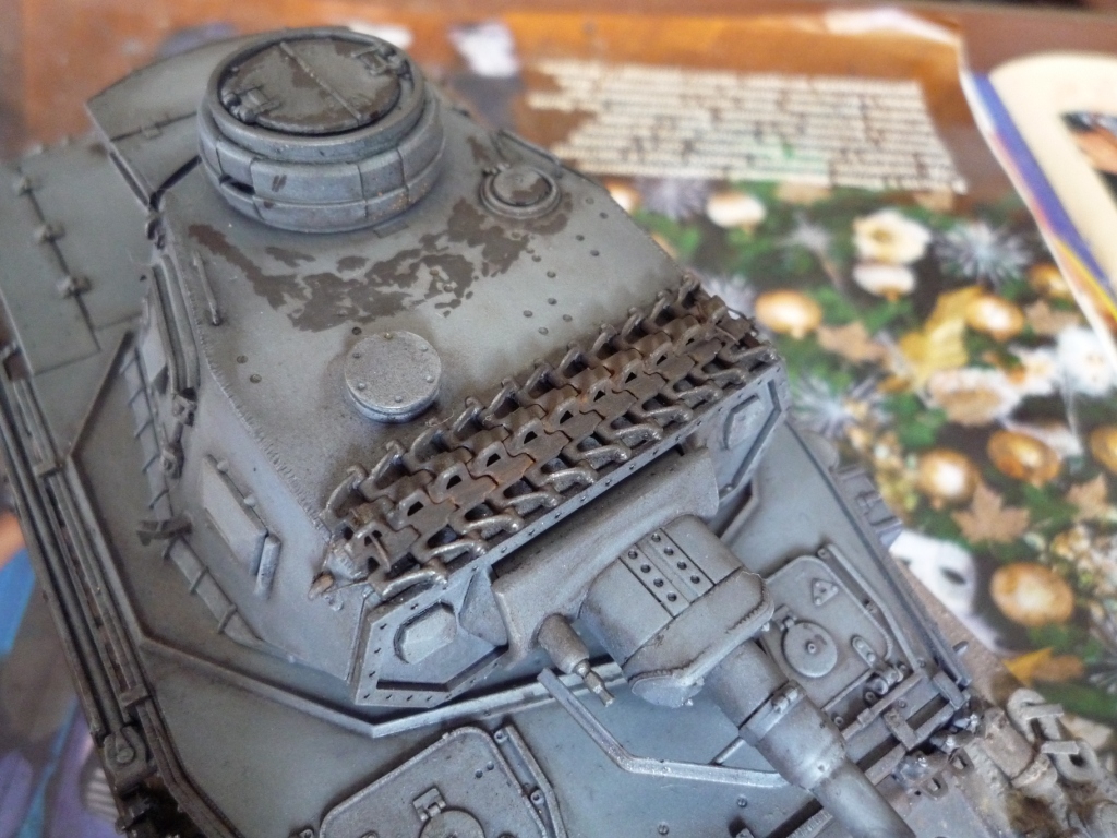 Потом чипинг...Недостоверно. Крупные и сформированные пятна чипинга не имеют достоверной основы - если смотреть на реальные ржавления/облупления красок.И также не имеют реальности в реале - вряд ли перед комбашенкой отплясывали гопака. Чтоб стереть краску до металла. Скорее, такие повреждения более характерны под боковыми люками...