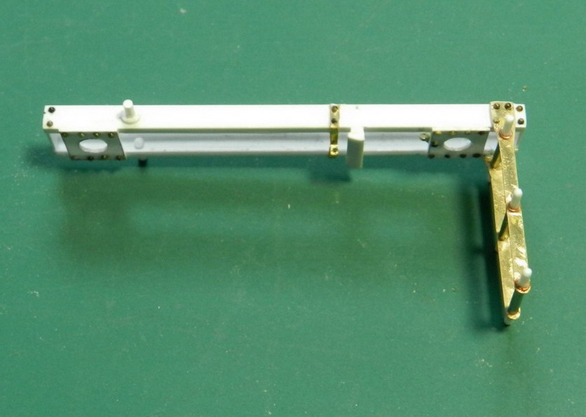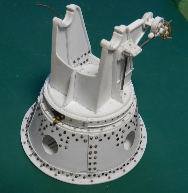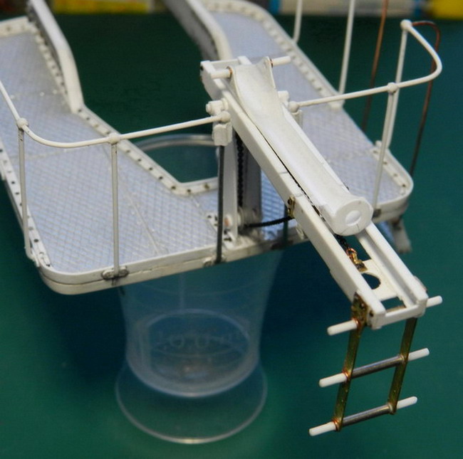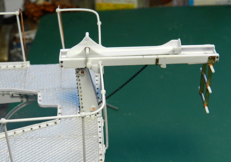 Сделал из пластиковой трубки лоток для подачи снаряда. Установил его колёсики внутри рамы и приклеил к осям сам лоток. На площадке приклеил станины с блоками и установил кран на кронштейнах в боевом положении.Потихоньку стал строить тумбу под лрудие.