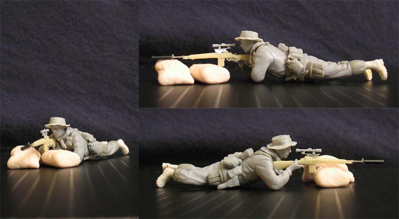 Андрей, винтовка нашлась в запасниках,вроде 5.45, а может и "танковская". Сначала хотел с "Ремингтоном" делать, но М14-ая мне просто нравится за свой внешний вид. Прицел срезал с немецкой снайперки из того же набора откуда и боец. "Немецкий" прицел внешне похож на то, что видел на фото. Кронштейн под прицел из фольги и тянутого литника. Глушитель - из литника.