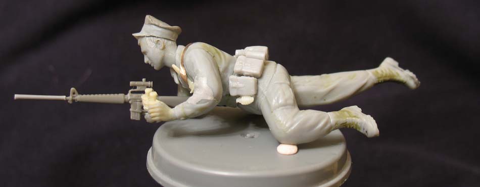 Arhipov Mihail, фигурка справа, была "задута" звездовским серым цветом, а после расписывалась акрилом Andrea. Я обычно изначально эмалью задаю требуемого цвета подложку, но в этот раз решил пойти от нейтральных оттенков. Собственно, то как фигурка выглядела изначально, можно увидеть на фигурке слева.