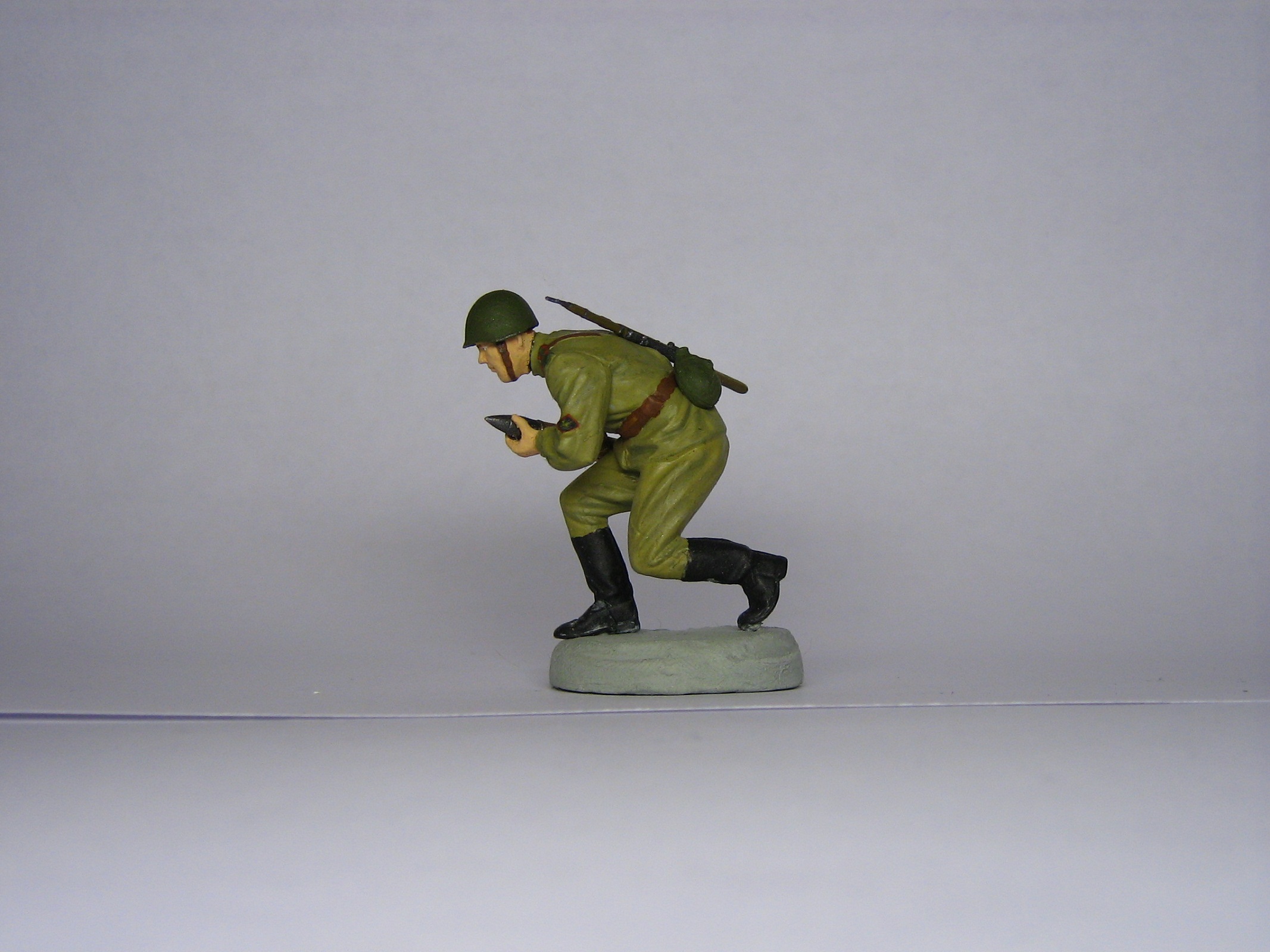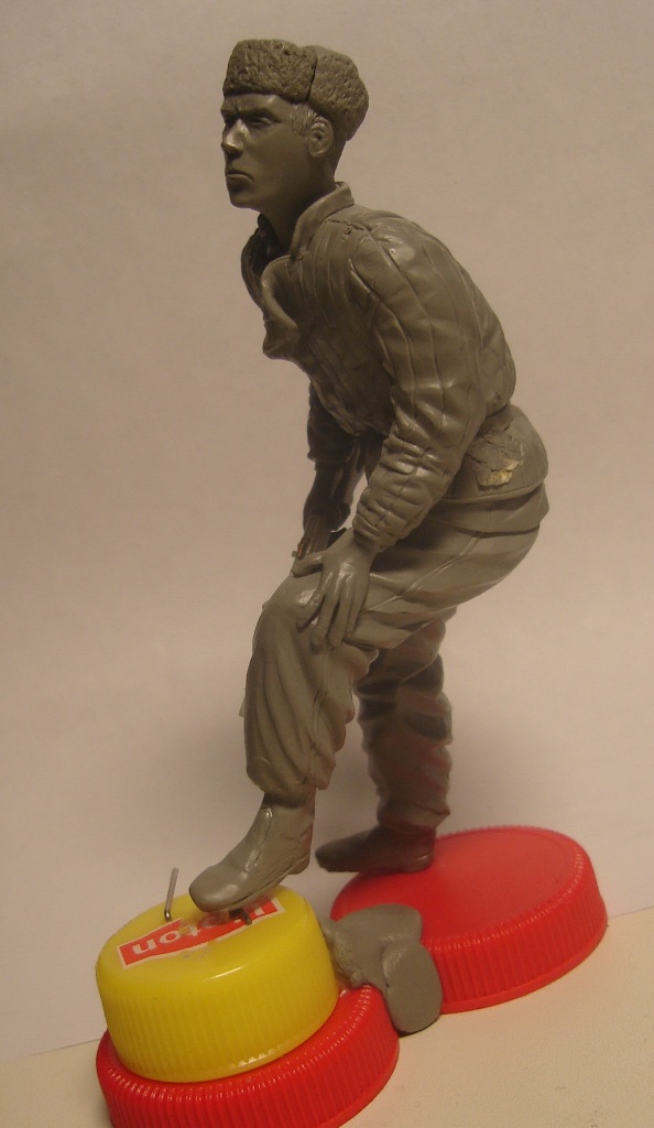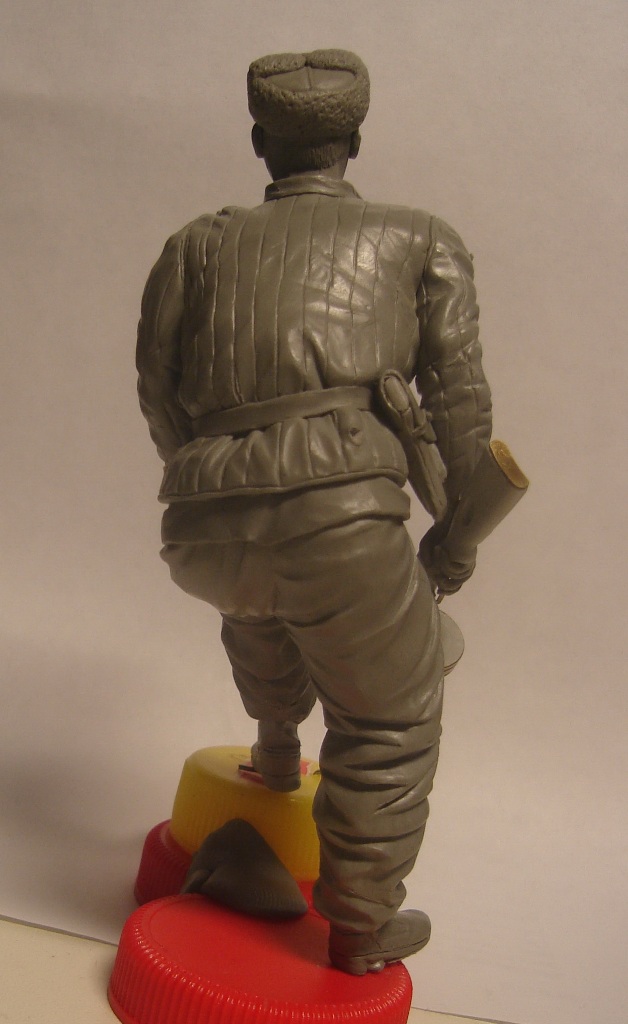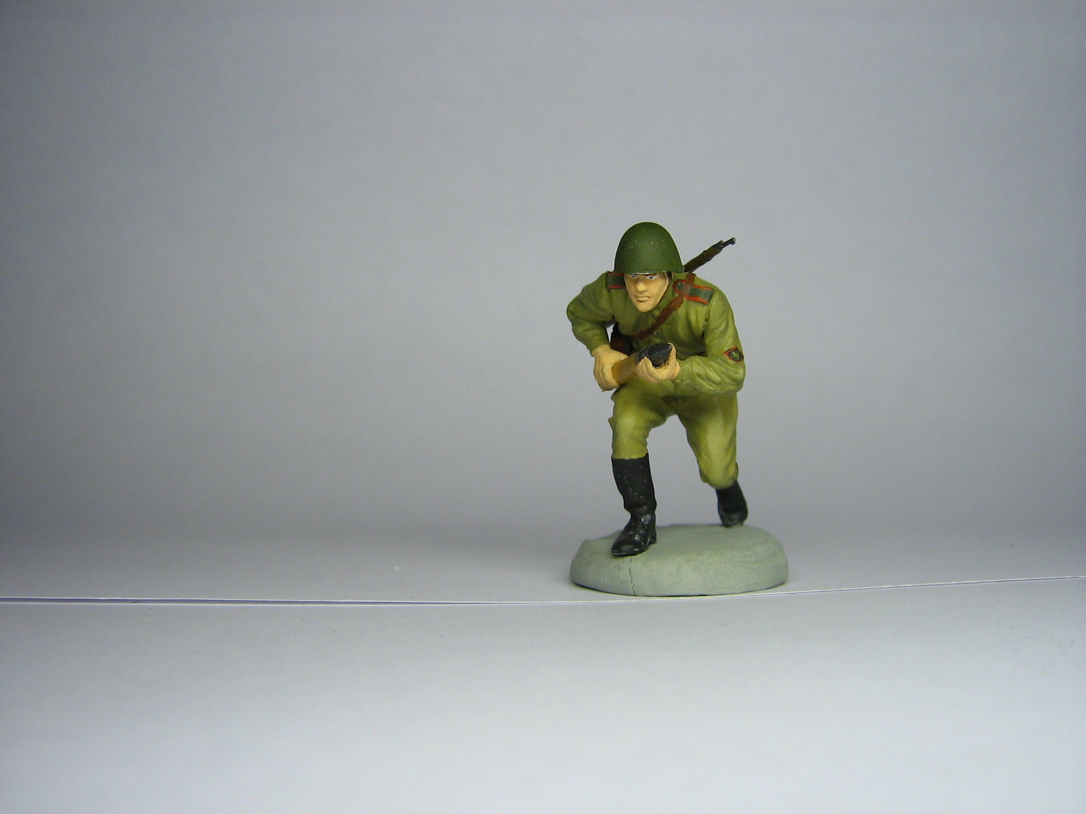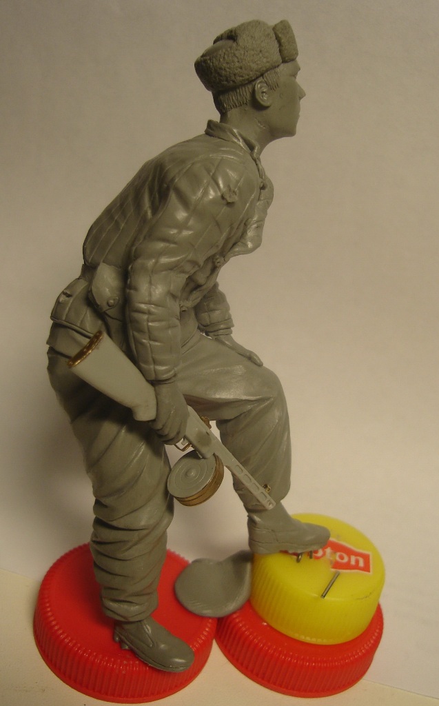 Зачесались руки чего-нибудь слепить, глядя на скульптурные опыты коллег. И заодно чего-нибудь покрупнее. Выбор пал на 16-й масштаб. Тут ввела в заблуждение так называемая классическая шкала масштаба - 120 мм. Поэтому фигуру и подгонял под этот размер. Только потом понял, что у меня получился дюжий хлопец ростом под 2 метра. Ну тем более сам Бог велел ему в разведроту. Лепя голову, попытался сделать бойца похожим на Григория Булатова, который первым, по словам его сослуживцев, водрузил знамя Победы на Рейхстаг. http://waralbum.ru/802/ Получилось увы ... Никак в общем не получилось. Материал - эпоксилин (кстати, на удивление хорошая партия попалась - очень пластичный, достаточно было легко лепить). Вооружил бойца ППШ от Трумпа, подточил приклад до более или менее похожего.