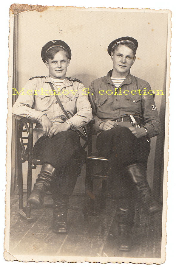Вернемся к этим орлам. Я так понимаю - это 43-й? Или дембеля в 45-м? Наверно всеже 43-ий. У правого офицерский ремень, а якорь: либо из пряги выточил, либо оторвал где-то. Ведь иногда на фотках попадаются металлические якоря. У левого звездочка на беске часом не до 39-го года образца? А по поводу тельников есть воспоминания врача из 255-ой БрМП, он вспоминал, что сухопутные ребята попав из госпиталей и по распределению в БрМП, брали тельняшку и разрезали ее, а потом вшивали в распахнутый ворот. Может это тоже самопал какой? Нашли зановеску с синими полосками и разрезали. Или еще вариант. В РИФе полоски по ширине устаканились только к первой мировой, но и позже на фотках попадаются такие тельники с широкими белыми полосками. Как Вы, наверное, помните в статье про сухопутную форму в Цейхгаузе, говорится, что флот накопил просто чудовищные объемы обмундирования, а потом выдавал их в носку. Может может ноги от туда ростут?