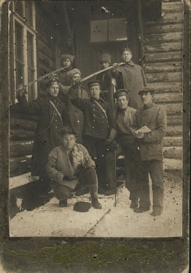 Шинель на 6 пуговицах, 3 выпушки на беске, широкие буквы на лентах, один в робе, один в "куртке для машынных команд". Летучий отряд по борьбе с контр-революцией? А бойцу на корточках хана похоже...
