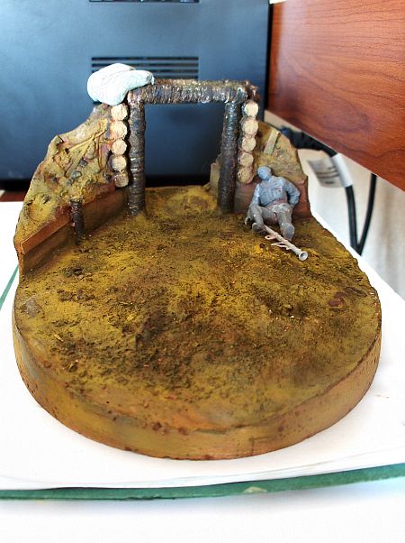Константин Чиганов, композиционное решение хорошее, как раз для небольшой виньетки. Только надо сам блиндаж как-то затемнением в проеме двери обозначить, например фигурку в самый проход поставить и что-нибудь типа занавески из циновки или плащ-палатки сделать. Чтобы дверь насквозь не просвечивала, иначе ощущения глубины не будет и вход в блиндаж на ворота в заборе не походил.