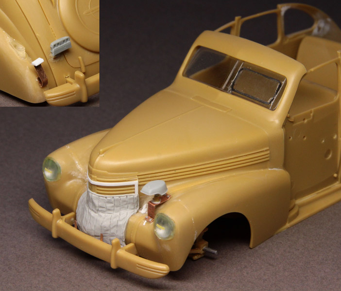 Сделал утепление на радиатор, крепление Нотека, номеров, обогрев стекла. Подогнал фары - с фарами в наборе небольшая проблема: они слишком выступают из крыла, а должны быть почти заподлицо.