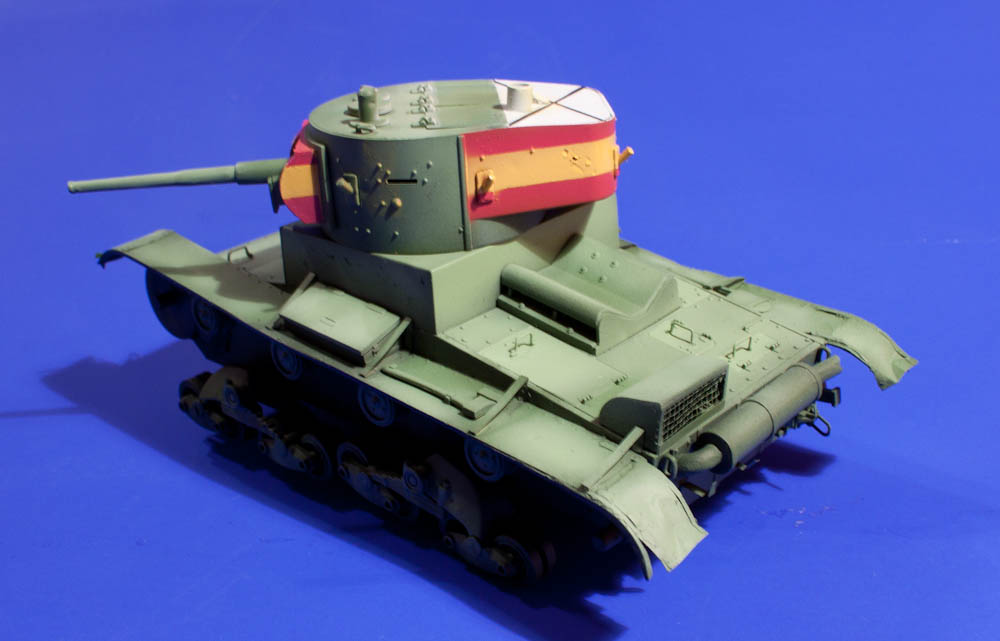Но есть небольшие претензии по матчасти. На Т-26 заглушки пистолетных портов были внутренние, а не внешние. На всех виденных мной фотографиях Т-26 в Испании у них штампованная маска пушки, а не сварная. Зашиту над жалюзи воздухопритока к двигателю стали устанавливать по опыту войны в Испании. Если у Вас есть фото подтверждающие наличие в Испании Т-26 со сварной маской пушки и при этом с защитой на воздухопритоком я буду только рад их увидеть. Укладку топора не на ту полку спишем на франкистов )))