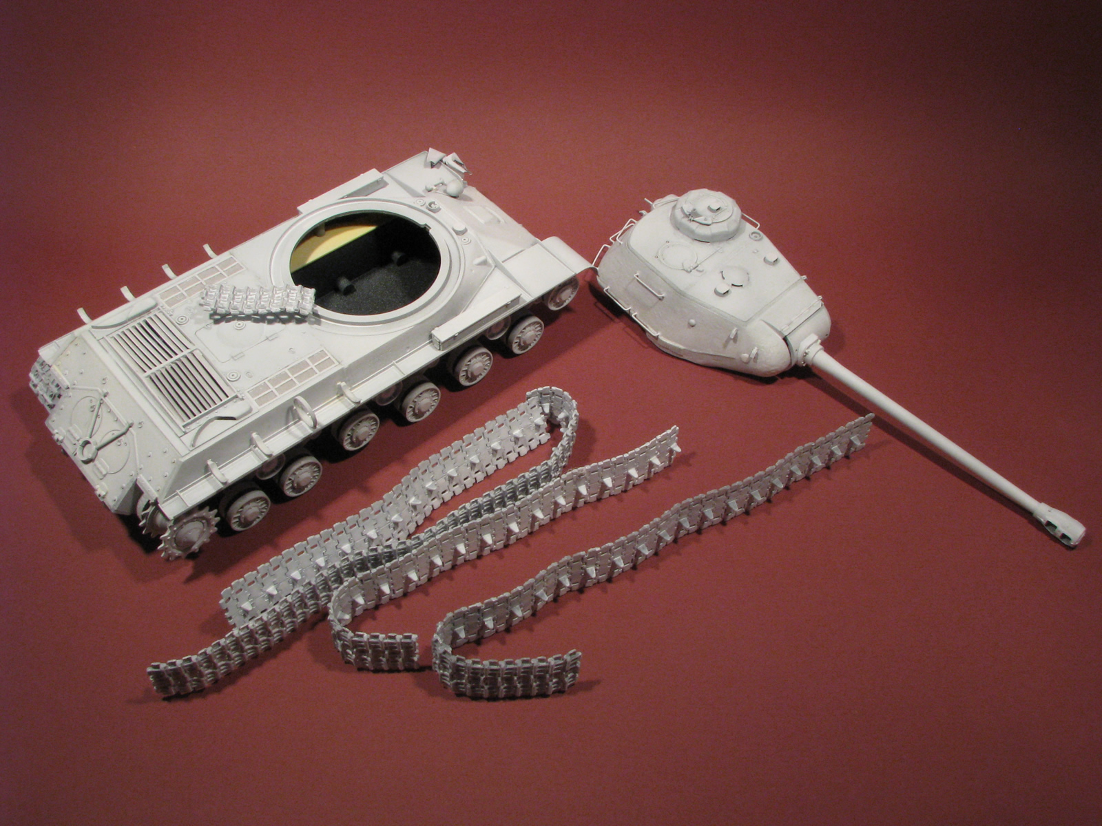 История этой модели ведёт своё начало с того времени, когда на эмали Humbrol молились все моделисты, акрила не было и в помине, а нитроэмали господствовали и крепкий запах растворителя «646» витал в квартирах моделистов, нервируя домочадцев. Как-то раз я, потрясённый мощью этой машины купил этот набор, но впоследствии, увлечённый работой над другими моделями, отложил набор и благополучно забыл о нём. Далее последовало несколько больших перерывов в работе, и вот, наконец, спустя много лет, до него дошла очередь. Проводя беглый осмотр литников, и ещё не зная о многочисленных ошибках производителя, я отметил как довольно большое количество облоя и утяжин с одной стороны, так и хорошее качество передачи деталировки, и оптимальную твёрдость пластика с другой. Первоначально не планируя большого объёма доработок, по мере погружения в процесс я понял, что так не поучится, по тому как, цитируя героя одного кинофильма «Да не годится это всё!». Таким образом, взвалив на себя это ношу, постепенно, в ходе работы я понял, что наибольшее количество доработок коснётся верхней части корпуса и башни. Первыми доработками стали традиционные решётки и жалюзи МТО.