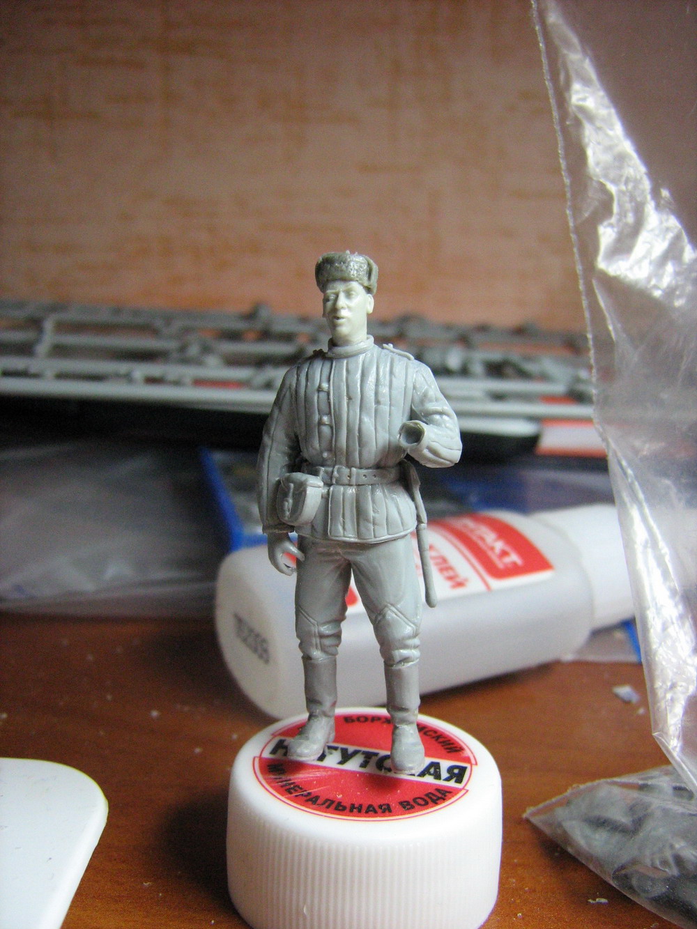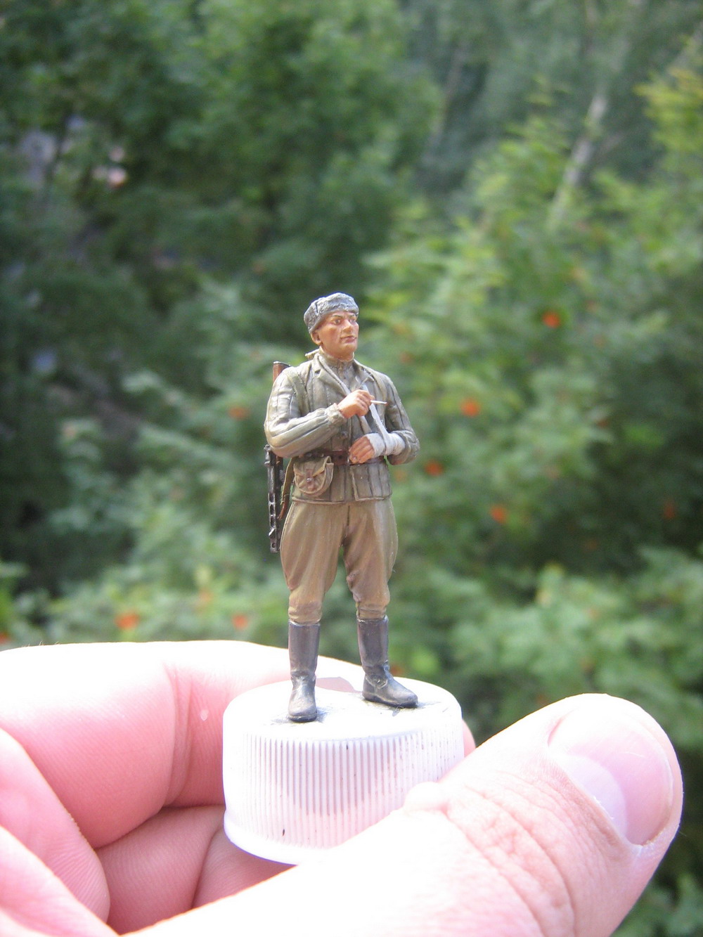Отважился ,друзья,собрать диораму.И по-тихоньку собираю фигуры к ней.Понравилась мне фигура ICM-ого парня с цигаркой.Из доработок:заменена голова,ушанка,добавлен ППШ и сумка для магазина к нему.Всё про-во "Танк".А также ремень к ППШ из свинцовой фольги.Сигарка из проволочки D=0.3 mm