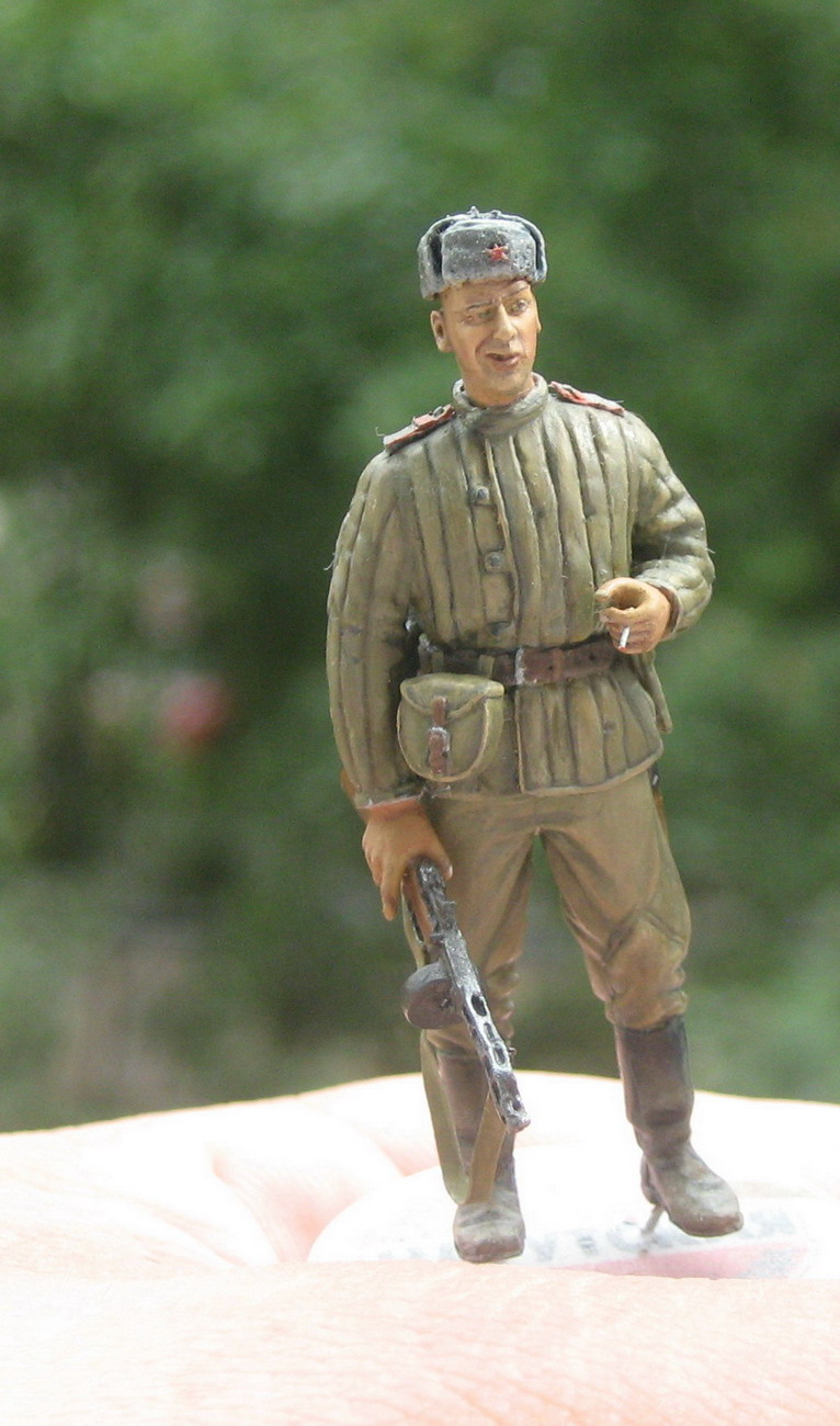 Фигура из набора Драгон "Soviet Guards Infantry 1944-45".Сапоги от "MiniArt"т.к. родные показались больно узкими,голова"Hornet",а ушанка-"Танк",кисть из закромов,папироска из проволочки Д=0.3 мм,ремень к ППШ из свинцовой фальги.