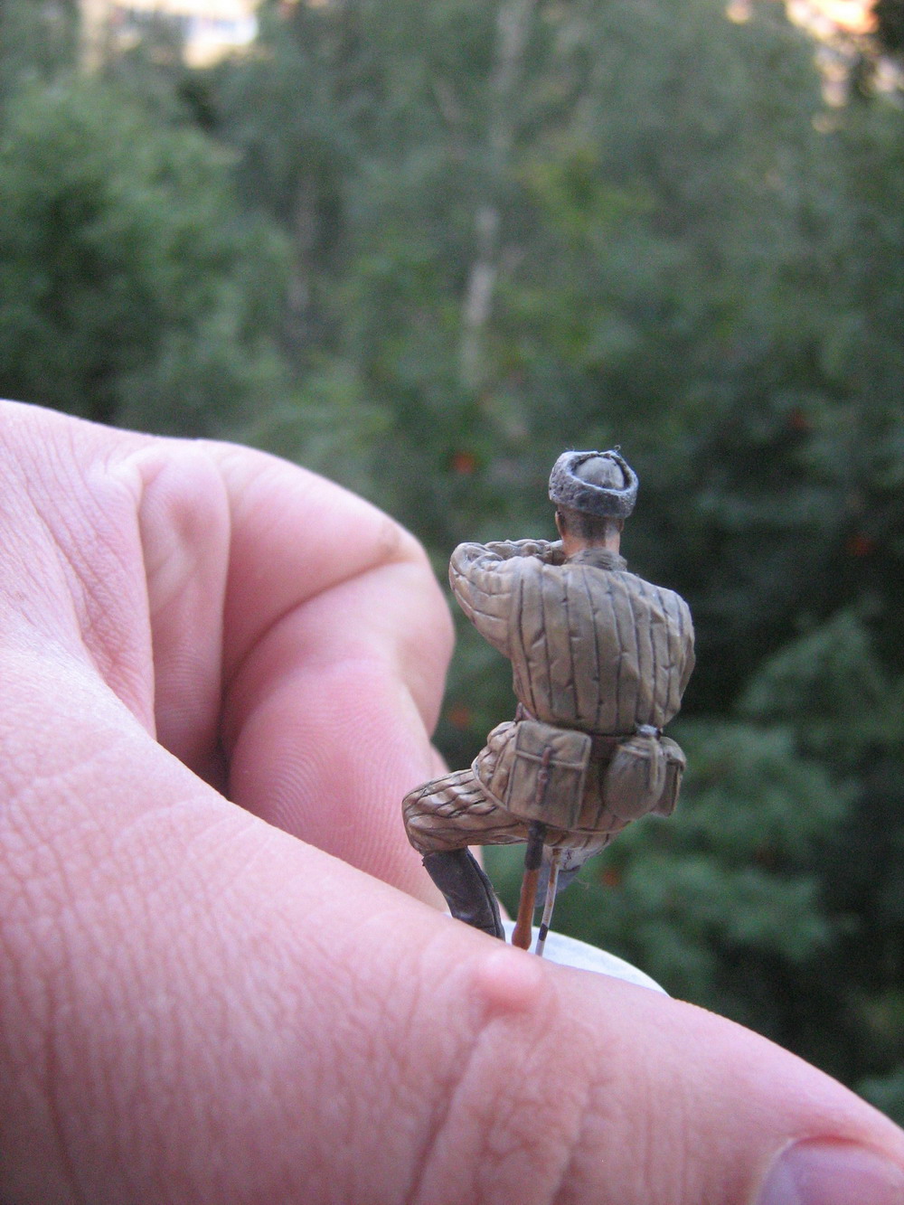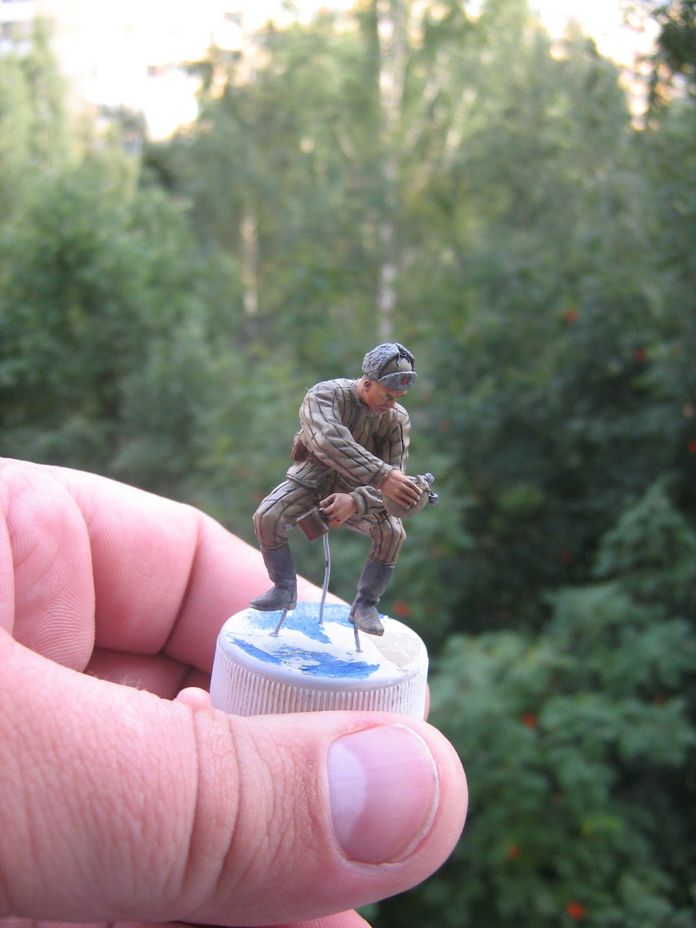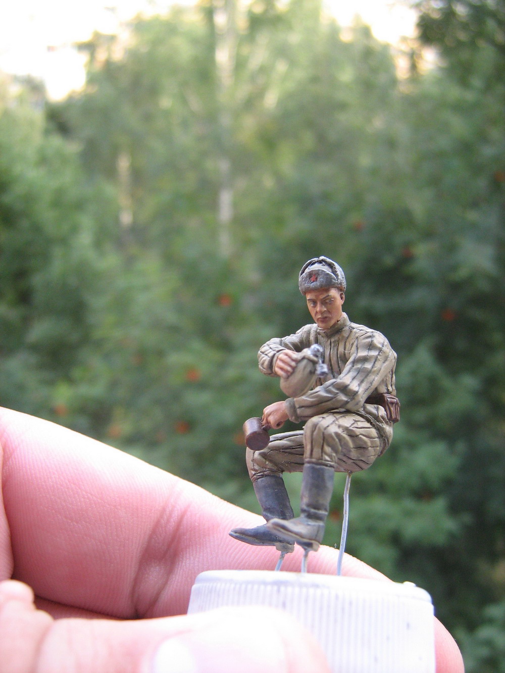 Очередной боец.Фигура из МиниАртовского набора.В процессе сборки заменил "родную" голову на Хорнетовскую,проработал поднутрения,кисти рук,на ватнике проработал прострочку,ремень.В кружке сделал стенки масштабной толщины и добави ручку из полоски травлёнки.Сегодня сделал крышечку для фляги и повесил её на цепочке.Цепочка-медная проволочка из оплётки кабеля.