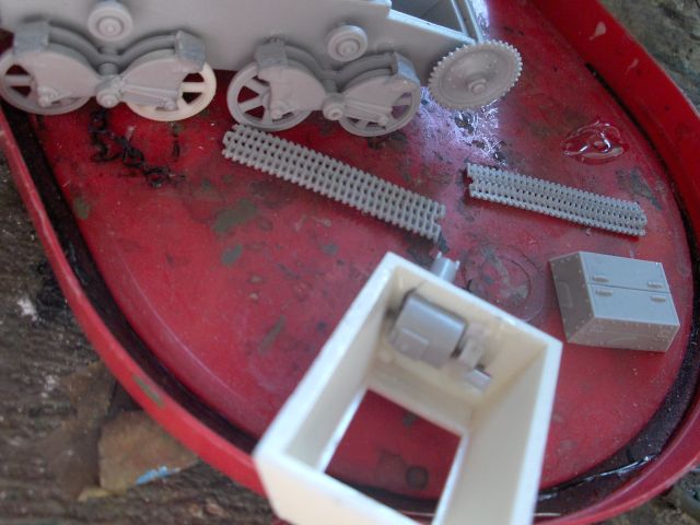 Вот и готово. Использовано кое-какое травление из запасов. Выбран (осторожно) сверлом бормашинки раструб глушителя. Естественно, верх и низ корпуса пока не склеены, просто сложены. Теперь можно обезжиривать в теплой фоде с Фейри, промывать в чистой теплой воде, и сушить перед грунтовкой. Не забудьте закрыть пробку слива в ванне, где это все удобно делать. Мало ли что...