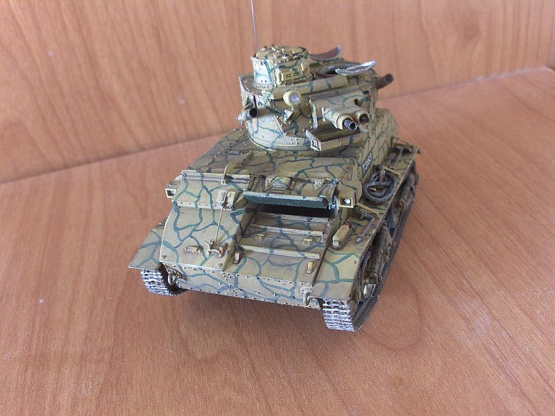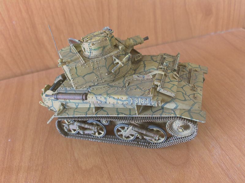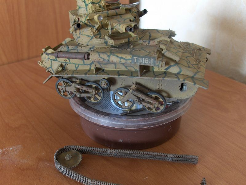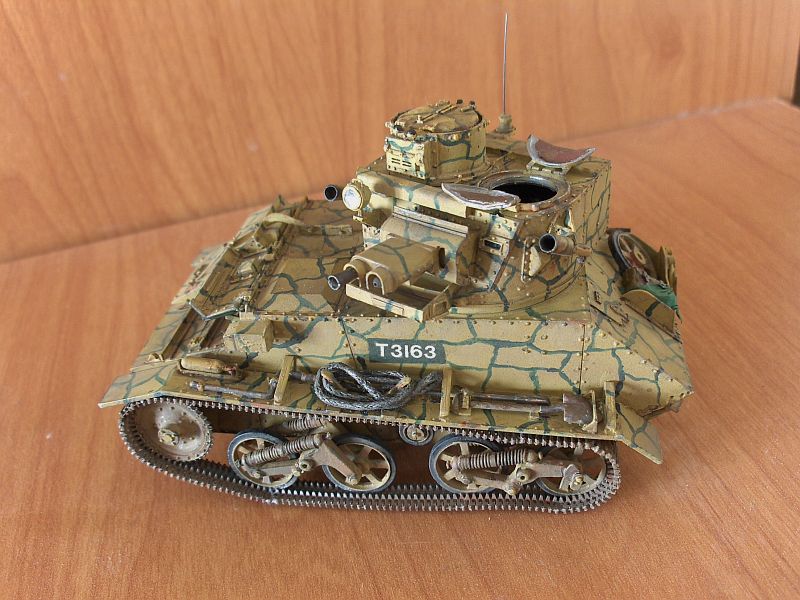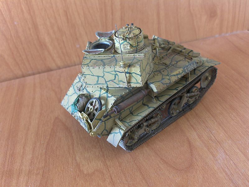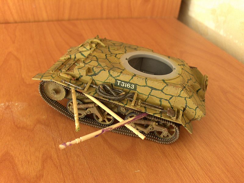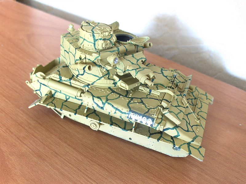 Еще нет ни фильтров, ни сколов, ничего. Свежевылупился. Только "сетка" полос. Они нарисованы кистью акрилом. На старых фото нет ни одного "стандартного" элемента этого камо, все явно рисовали "из головы". Заметно лишь, что на приведенном в начале фото Виккерса пятна песочного на корпусе, особенно спереди снизу, крупнее, чем на башне.