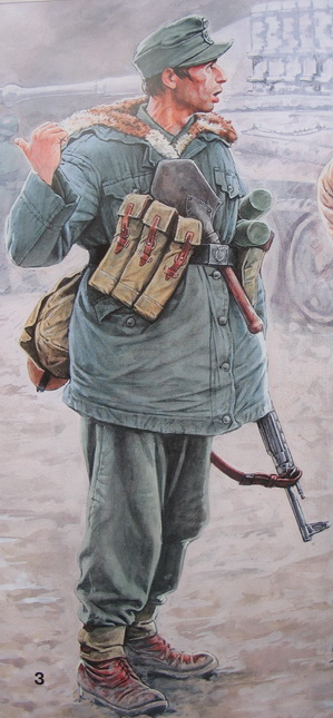 Боюсь, что своим советом насчёт расцветки штанов буду не совсем объективен. Ну не нравится мне камуфлированная униформа - и всё тут. Да и потом, "зимние" немцы и "осенне-летние" штаны... Что-то на фото такого не встречал. Хотя, на конец войны, говорят, встречалось. Ещё довольно распространённый вариант - сделать низ белым.