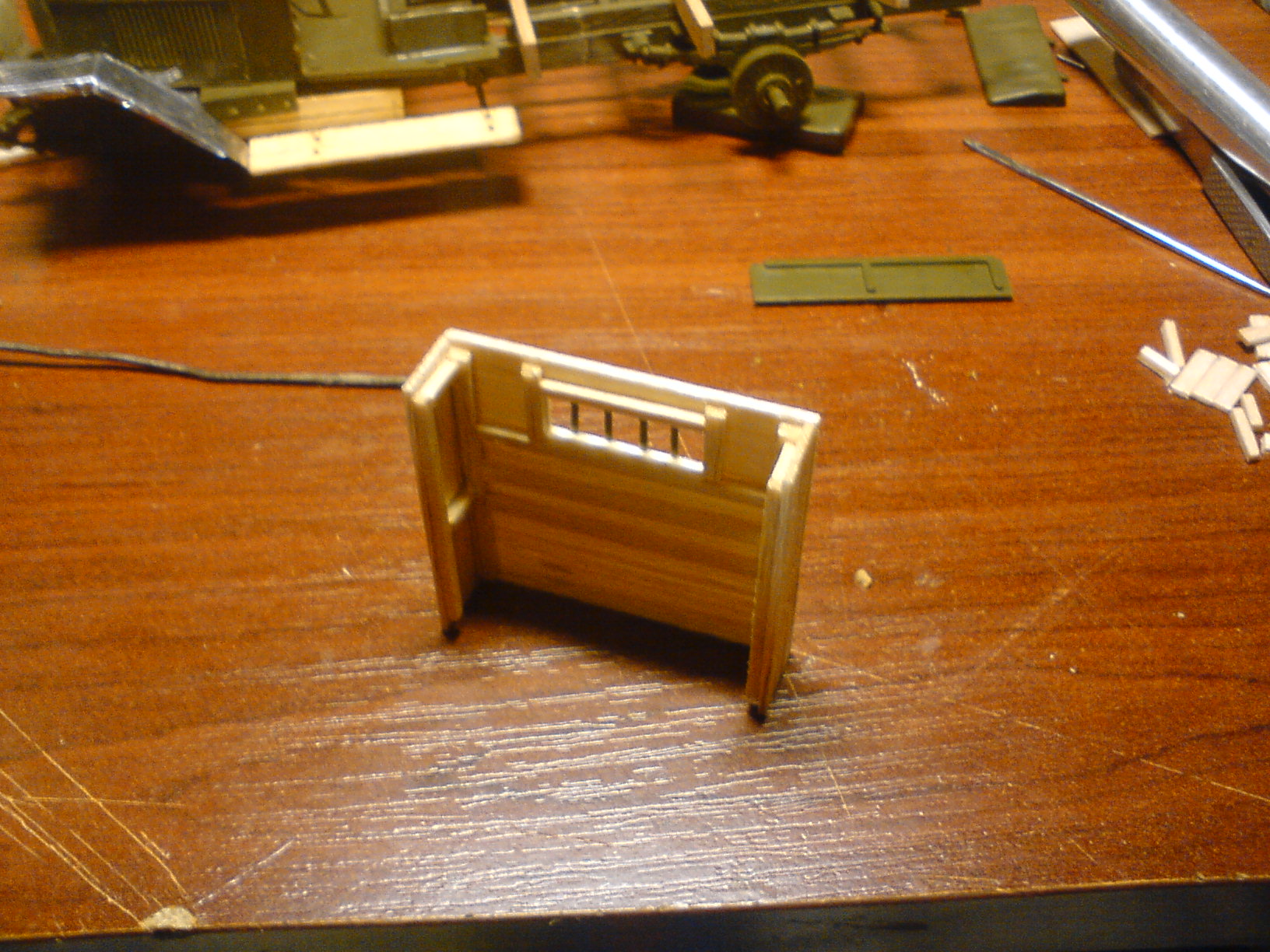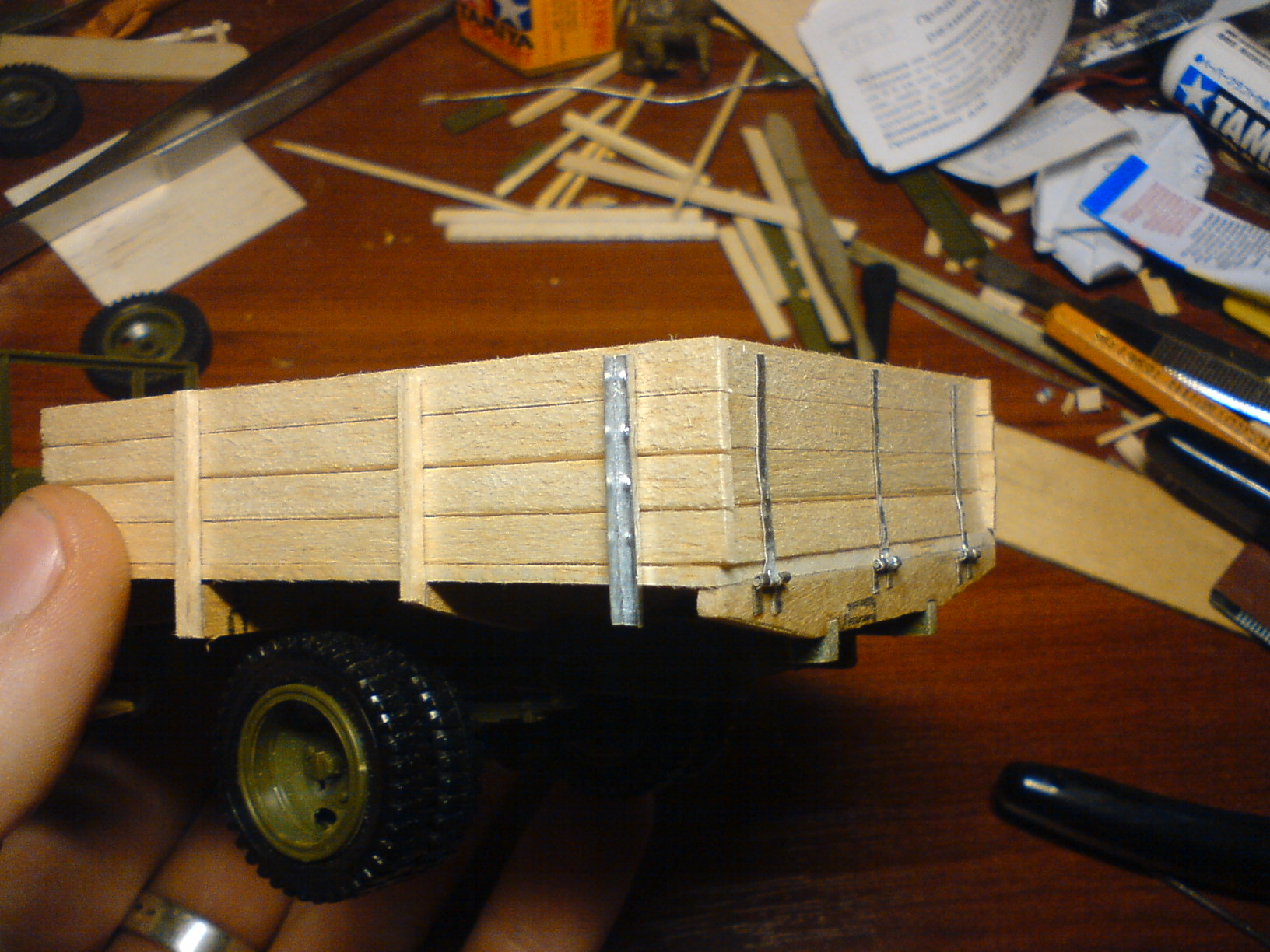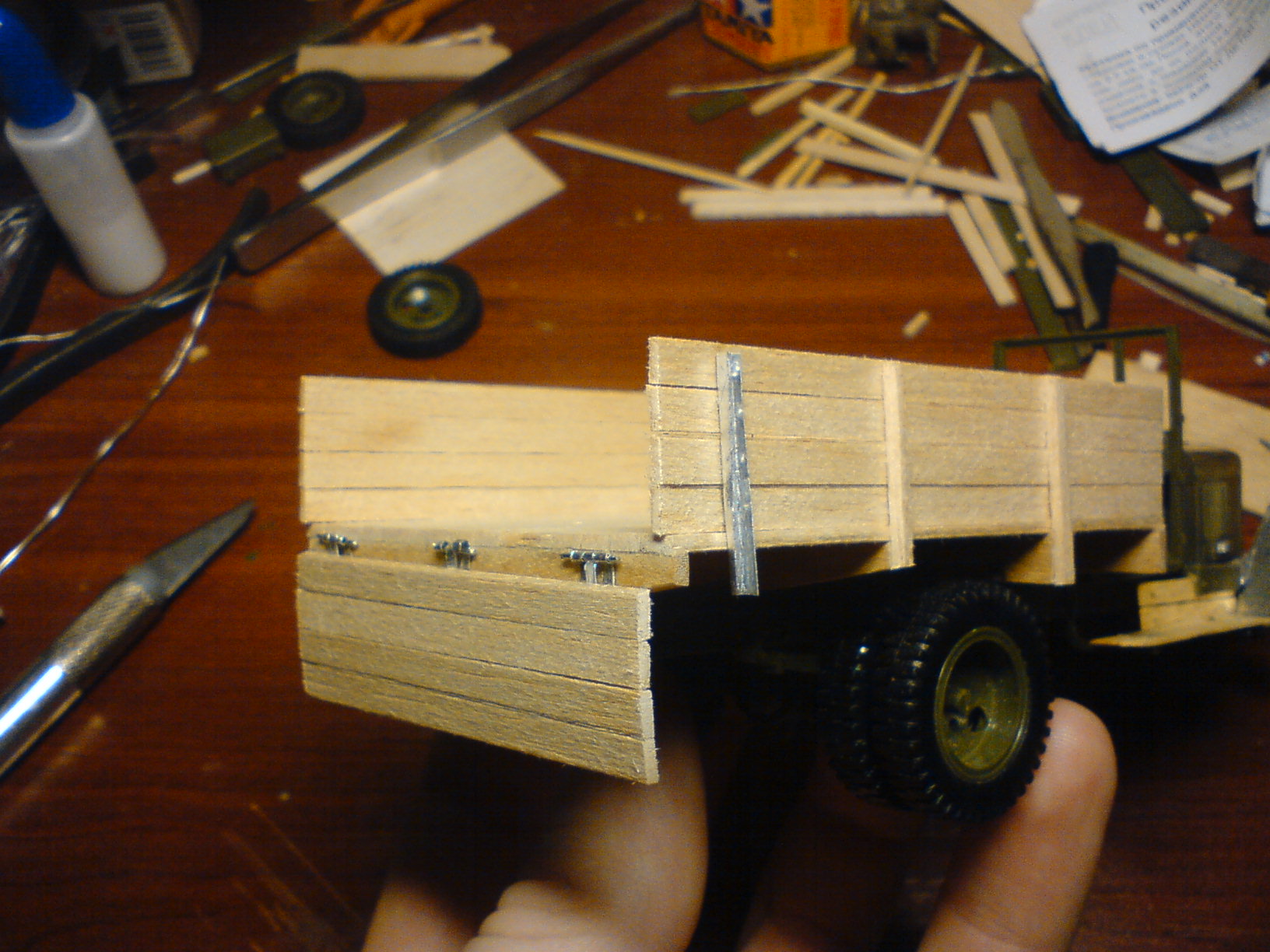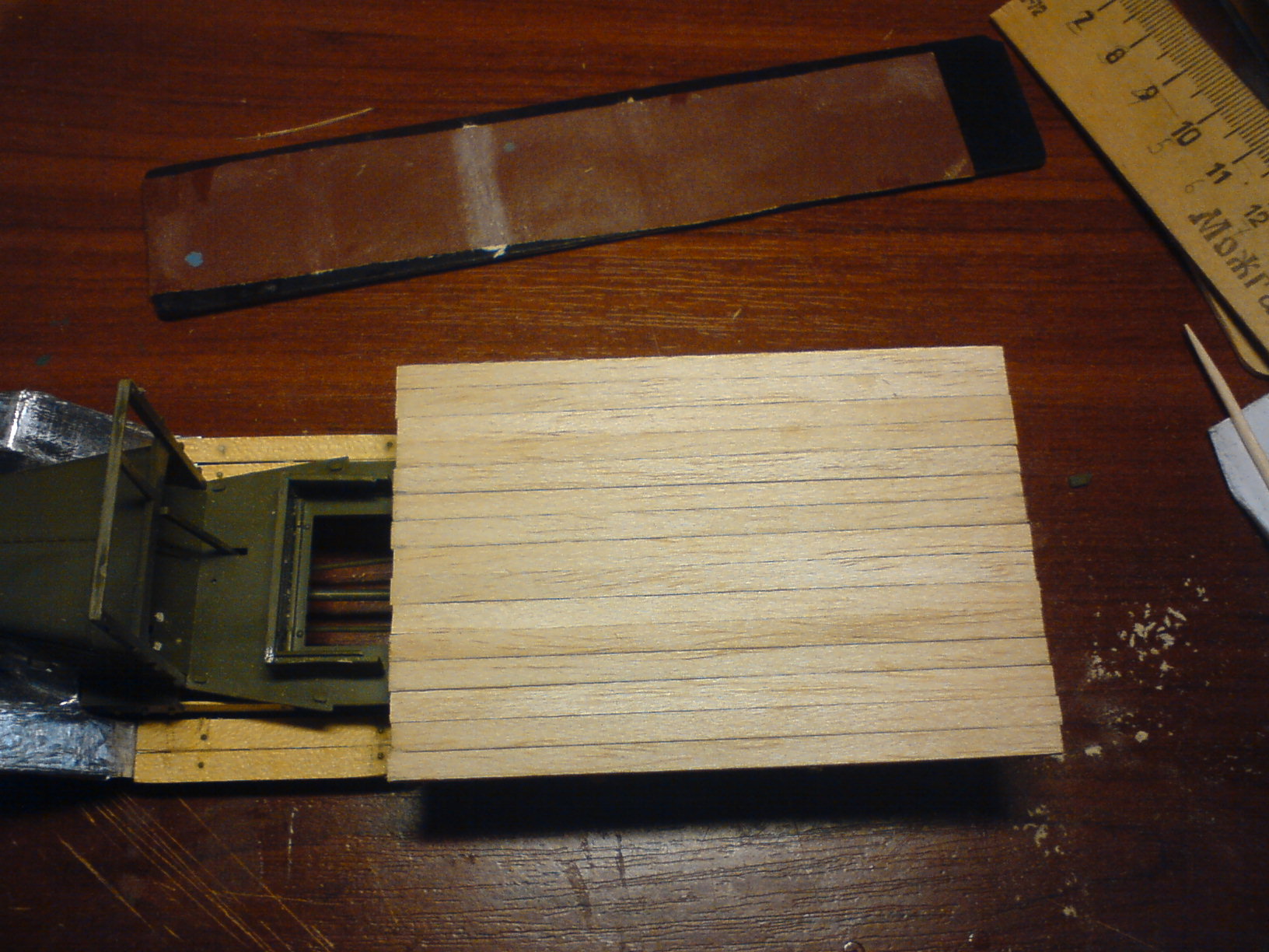 BVM, Да, вы правы. На грузовиках вышедших с завода именно так и было. Но я не стал заострять на этом внимание. Во-первых - в полевых условиях может быть все что угодно, и то что взамен пробитых и обгоревших досок могли поставить обычную, не пазованную доску, тоже могло иметь место. Во-вторых - пазы конечно прорезать можно было, но этот процесс долгий и трудоемкий, и не отвечает поставленным мной задачам и моей задумке. Если бы я хотел создать абсолютно точную и аутентичную модель авто, то возможно я бы и поставил доски как надо, а так я всего лишь хочу поэксперементировать с натуральным деревом, и поработать с различными приемами "обгадинга" и "износинга" на этом материале