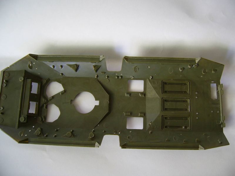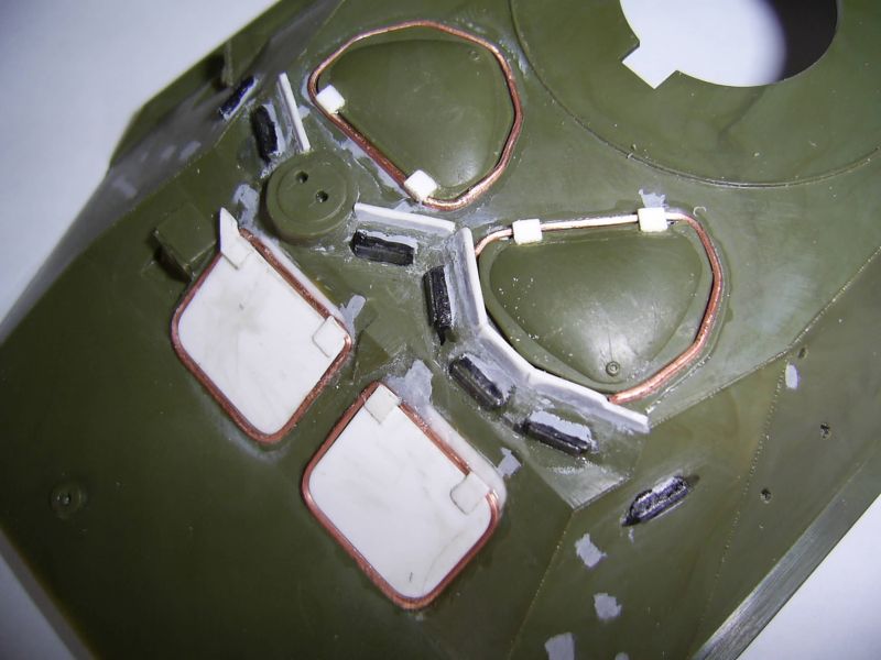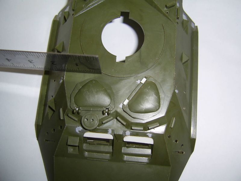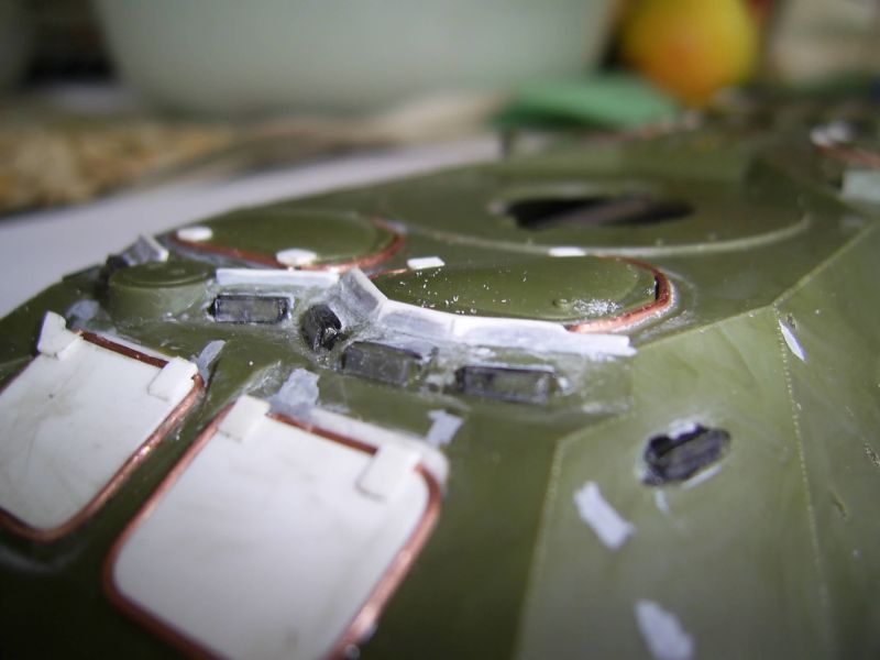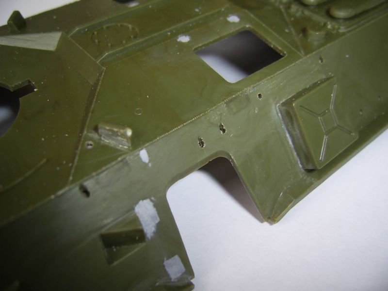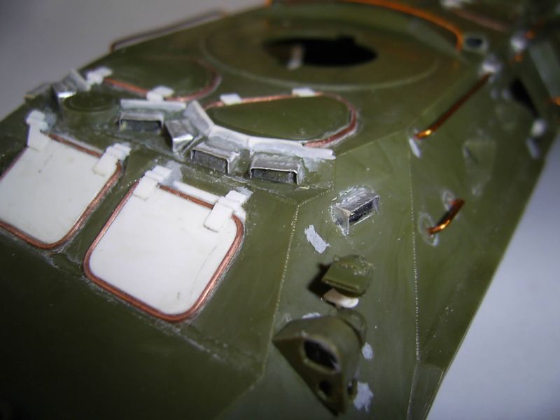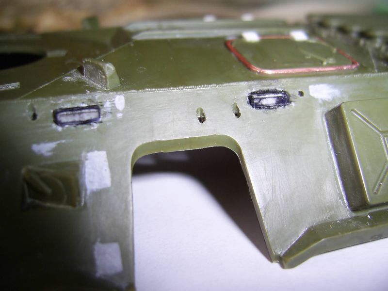 Корпус, похоже, таки короче в передней части. Должен быть сварной шов перед пулеотбойником. Его нет. И петли люков, по большому счету, будут упираться в башню. Верхние крышки люков все-таки пришлось сточить. Получается уже не копийно, но деваться некуда. Сами крышки люков стали меньше. Пришлось заделать отверстия под верхние и передние крышки люков. Передние крышки будут чуть опушены вниз, а то петли тоже не поместятся. Перископы на ботрах срезал. Они должны быть немного ниже. Сами обзерочки не выбрасваем: их потом наклеем и на них потом будем лепить жесть. Верхние перископы на крыше десантного отделения тоже будем выбирать изнутри.
