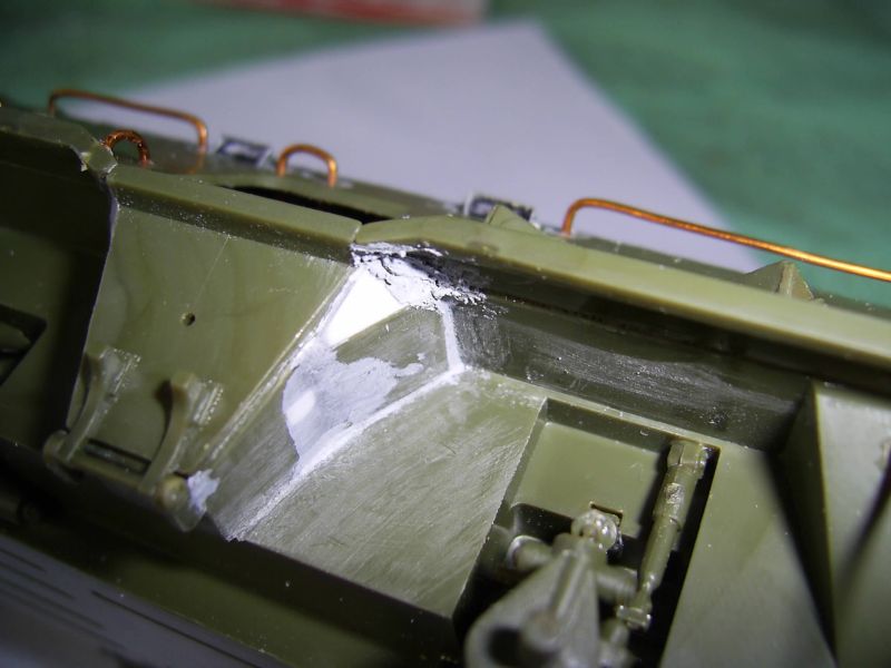 Для начала срезал петлт крышек люков. Снизу подклеил кусочки литника и все зашпаклевал.