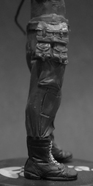 - поработай над формой ботинок. Форма их схвачена ели-ели. Приходит это и с опытом и со старанием. Не бойся делать этюды. Я, на неком своем этапе творчества, однажды поставил берц на стол, облажился кучей фото и долго и нудно лепил из пластилина ботинок где-то в масштабе 1/2. Думаю что помогло. Шнуровку тоже пока не пытайся выполнить досконально - это приводит к её гиперболе и переразмериванию. Скорее старайся схватить общую форму и текстуру шнурованной части ботинка. Я никогда не вылепливаю шнуровку по каждому шнурочку, а всегда леплю её с помощью обычной и медецинской иглы из массива ботинка.