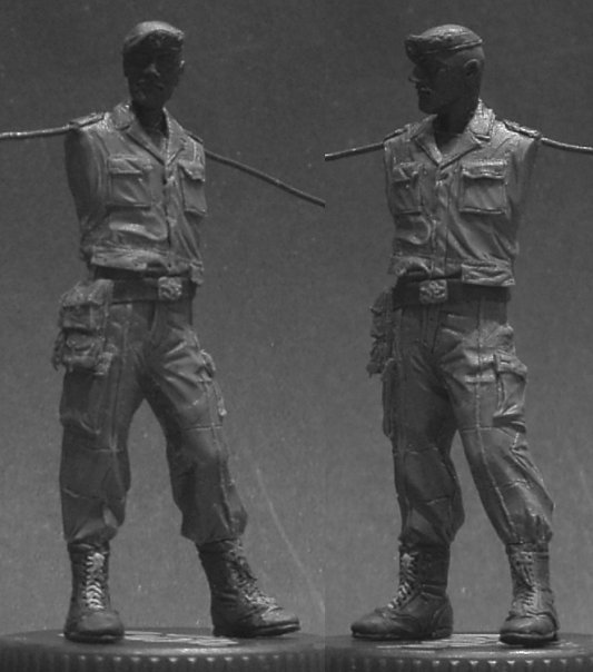 - немного не угадал с позой. Если бы ты отклонил немного грудную клетку назад, а голову наклонил бы вперед (как на реальном фото бойца), то поза при виде в профиль стала бы много естественее.