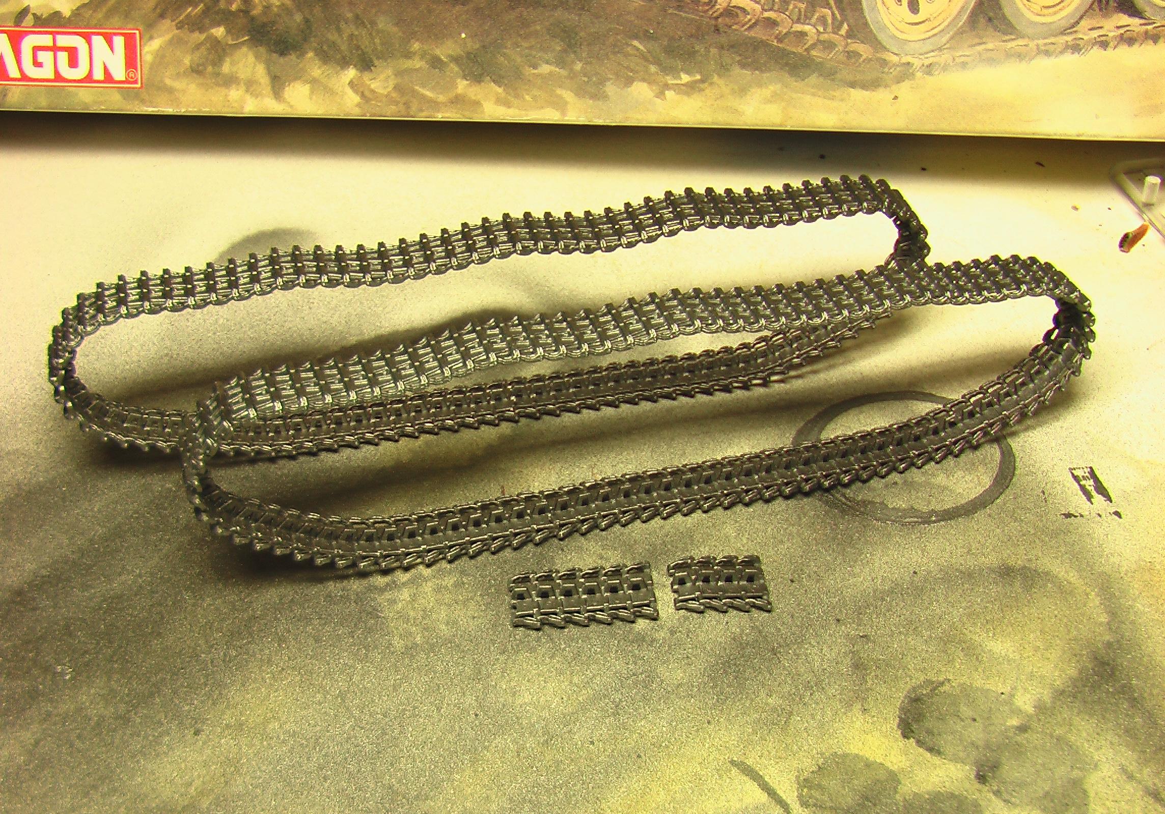 Честно говря даже представить себе не могу как это возможно.Гусянку собирал всей лентой сразу.В инструкции указано количество траков,которое понадобиться.НО!Не всегда это правда.Тут нужно смотреть по ходу работы.Кладем на столе трак гребнем вверх.Капаем мааааленькую каплю клея в углубления под следующий трак(тут я использую только клей с иглой "faller"у него игла тоньше,чем у Ревела,но это не принципиально.Можно и Звездовский кисточкой наносить.Но ели клея будет мало,то потом все развалится.)и так один за другим,пока не соберу всю ленту.Занимает минут 20-30.Собираю обе сразу.Катки и звездочки на сухую ставим на место.Но садиться должны плотно.Не падая.Не всегда получается так,тогда можно на каплю ПВА посадить.Ну и как только закончил вторую ленту,первую можно накидывать на катки.Огибаем звездочку,поддерживающие катки.Делаем провисы.Лента мягкая и великолепно гнется.Соединяю ленту по низу,обычно.Так удобнее.Накидываю вторую и оставляю на следующий день.Все снимаю и крашу по отдельности.Никаких проблем.Не на всех моделях можно так сделать.Иногда приходится делать ленту из двух половин.Передней и задней.Так и красить.Потом уже при сборке она будет стыковаться сверху и снизу.