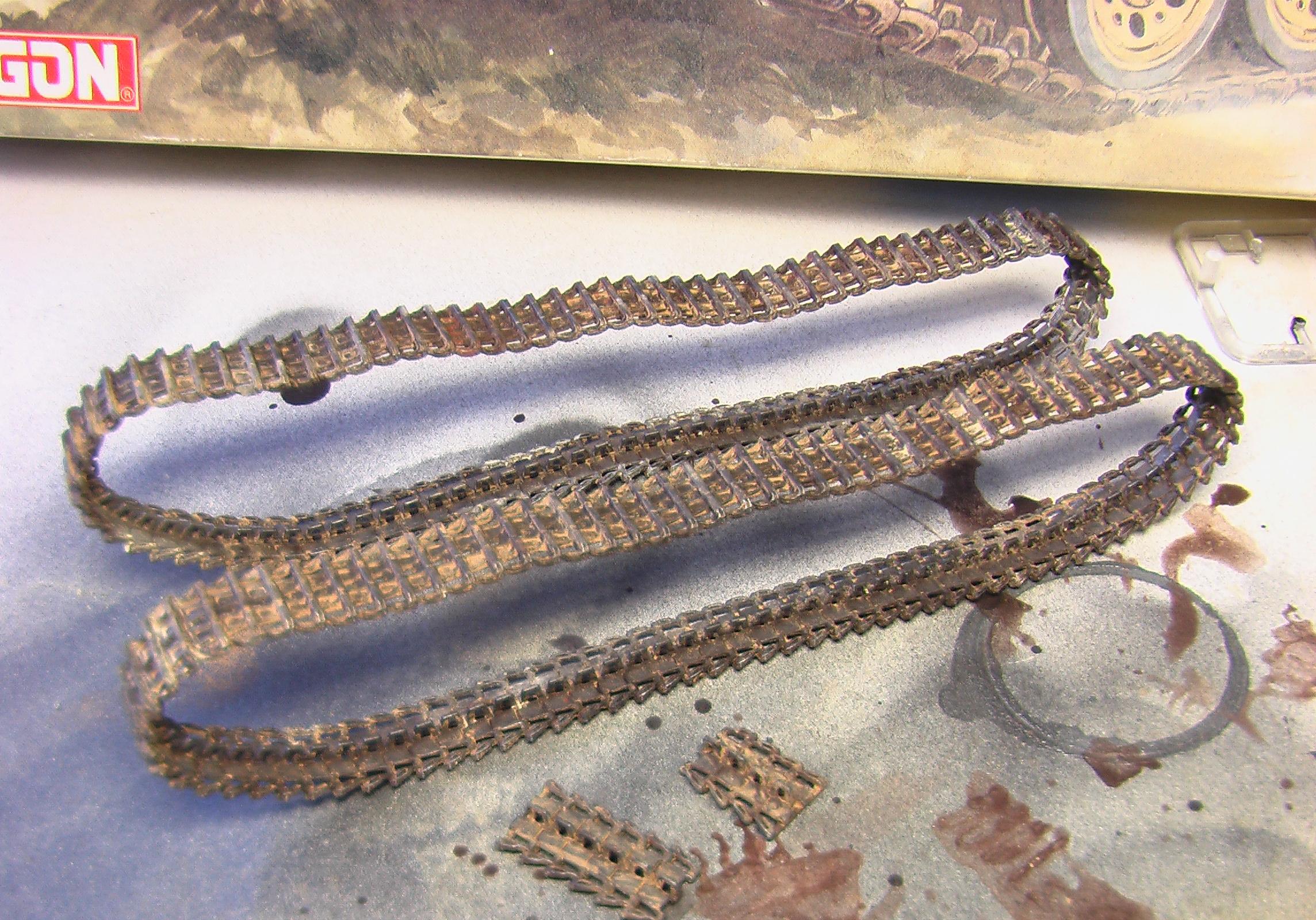 На смывку по гусеницам не нашлось нужного масла,потому пойдет в дело темпера "сажа газовая" и "сиена жженая".С начала прошелся черным,а потом смесью сиены и чуть черного.