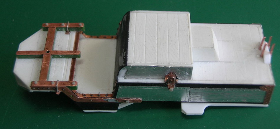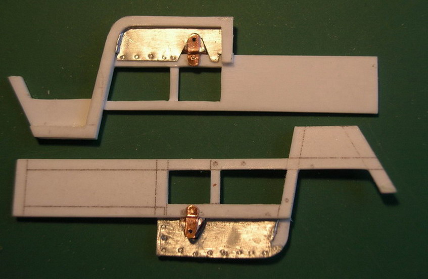 Ну а теперь начну собственно с модели.После распечатки чертежей на лазерном принтере, перевёл абрис стенок корпуса на пластик толщиной 1 мм.Таким образом создал как ьы каркас из перекладин обшитый фанерой.На боковых стенках сразу закрепил кронштейны для передних концов задних рессор хода.И "зашил" металлом из фольги пустоту.Вклемл поперечные перекладины и доски, формируя корпус.