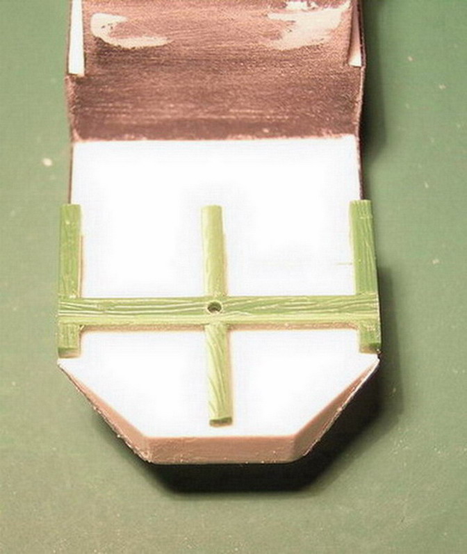 Продолжаю наращивать "мясо" на корпус. Из чёрного полистирола толщиной 0.25 мм. изобразил внешнее фанерное покрытие.Из обрезков полистироловой древесины склеил раму для поворотного круга переднег хода.