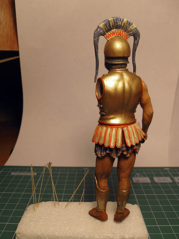 Во -первых транспортировка. Когда делаешь виньетку, то задумываешься о том, как её перевозить на различные выставки. Вопрос транспортировки стоит остро. На коробке показан гоплит (в моём случае Спартанский царь Леонид)у которого из щита торчат несколько стрел. Как перевезти фигурку и ничего не обламать при этом? Стрелы сделаны из тянутого литника (диаметр- 1 мм).