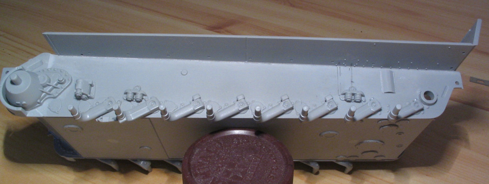 Набор очень хороший, но есть ошибки доставшиеся от G-ки и прибавились новые. Нижняя часть корпуса досталас от G-ки соответственно теже косяки, неправильное расположение головок винтов которыми крепятся амортизаторы на правой стороне. К тому же у F-ки отсутствовал задний амортизатор и естетственно его крепление. Поэтому задние головки cрезаем на обоих бортах, а переднюю правую перносим на правильное место.