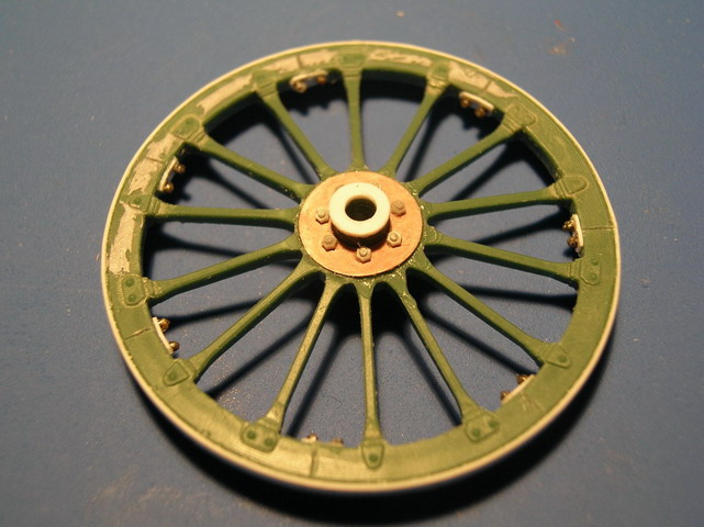 Для другого орудия на колёсах были срезаны крепления спиц, ободы прошпаклёваны, вместо травлёных дисков поставлены диски из тонкого полистирола, приклеены шины и накладки. Заклёпки и гайки пока не ставил. Колесо пойдёт под формовку. Надо будет ещё отлить пару для зенитного станка.