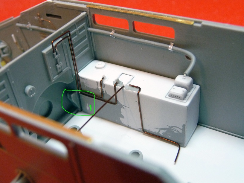 После грунтовки увидел некоторые косяки, решил устранить. Также решил добавить трубки, которые идут от топливных баков, их месторасположение взял с фотографий, приведенных в предыдущих сообщениях на http://leg1on.blogspot.com/.