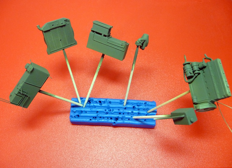 Сегодня я покрасил те же самые детали. Вначале испытал состав (XF-58, XF-26, XF-2, X-22), понял, что шагрень не убрать, при этом на пробниках шагрени не было, тогда я принял решение снять всю краску, в том числе и грунтовку.