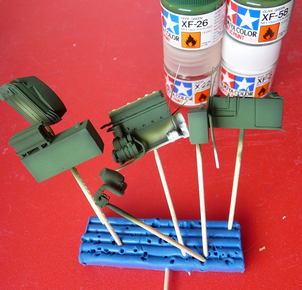 Вчера задул внутренности моторного отсека базовым цветом "Tamiya XF-58". Правда из-за того, что грунтовка плохо легла, поверхность получилась слишком матовой. Что-то сделал я не так, наверное, краску развёл слишком густо. Может не надо было грунтовать. В общем, постараюсь исправить это при покраске другими цветами и высветлении.