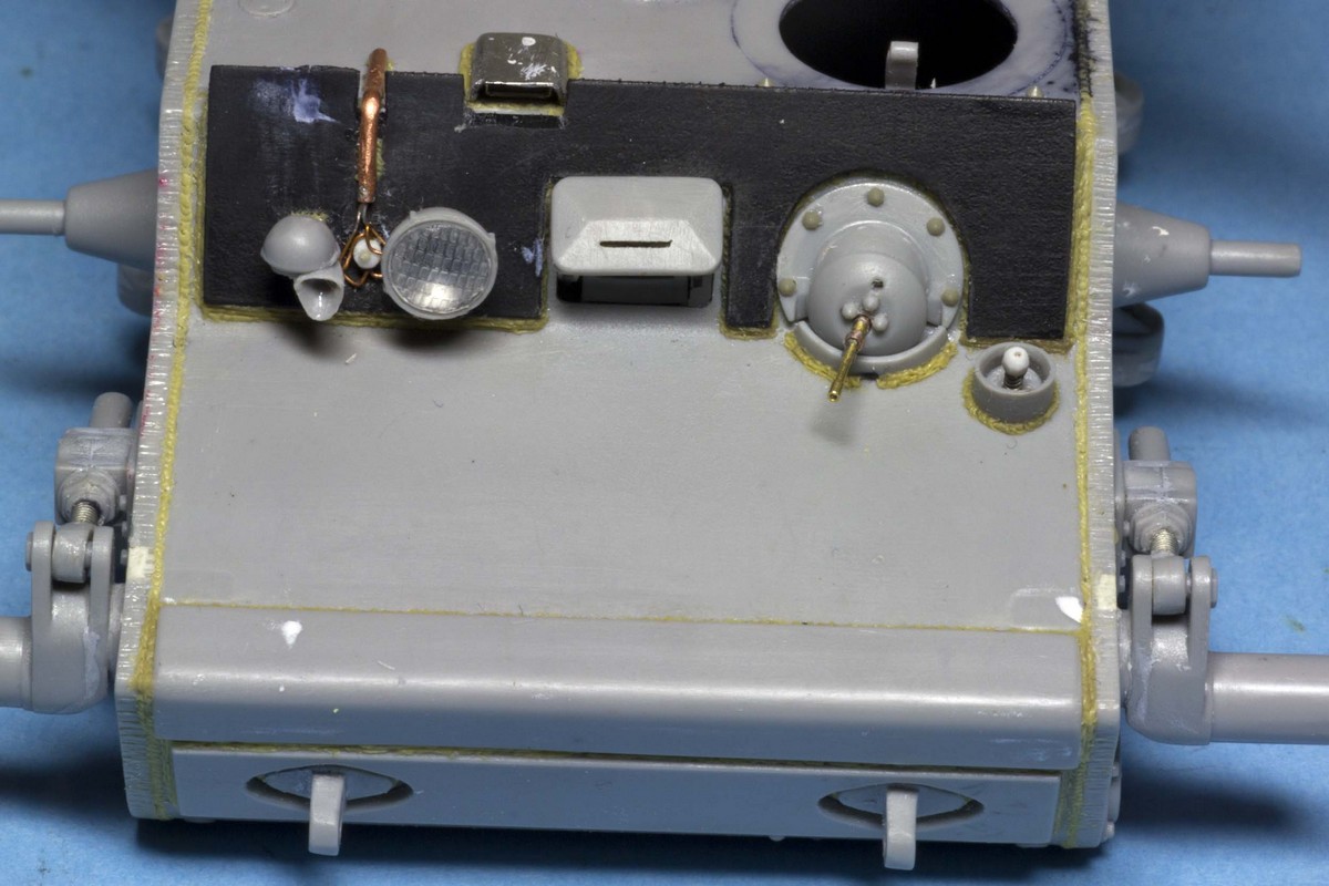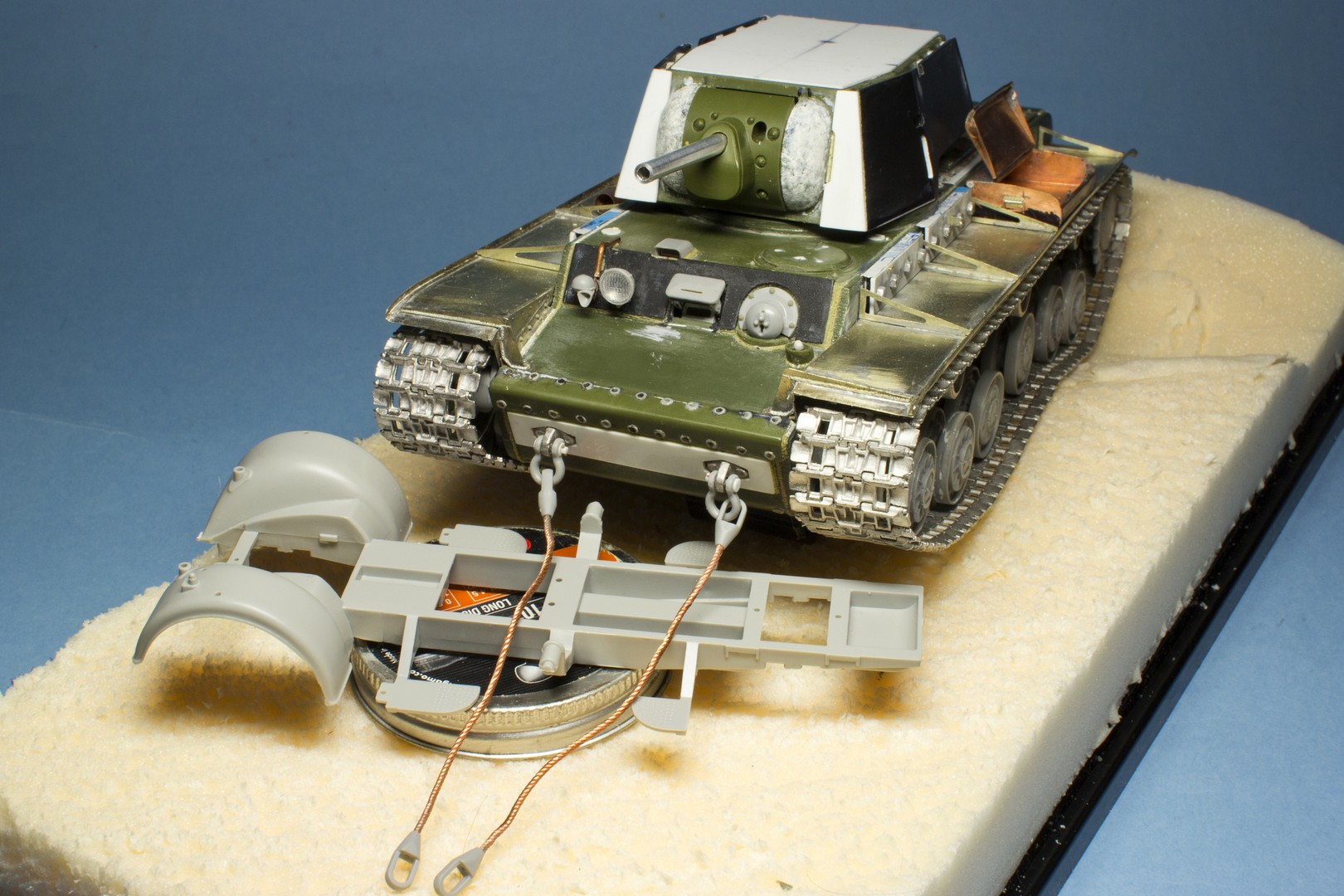 КВ-1Э. Работы по корпусу практически завершены. Теперь предстоит башня. Так как прототип стоит не на ровной поверхности, то сразу сделал заготовку подставки и закрепил балансиры в "правильных" позициях.