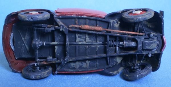 Поле долгой сушки окрасил последним цветом - замаскировав нужные места масколом и тамиевским скотчем. Вишневого тамиевского что-то не отыскалось, взял обычную "Супер" Звезды, глянец появится после лакировки. Пара крохотных дефектов краски меня не смутили - так даже больше похоже на поездившую машину - я же не из автосалона ее делаю.