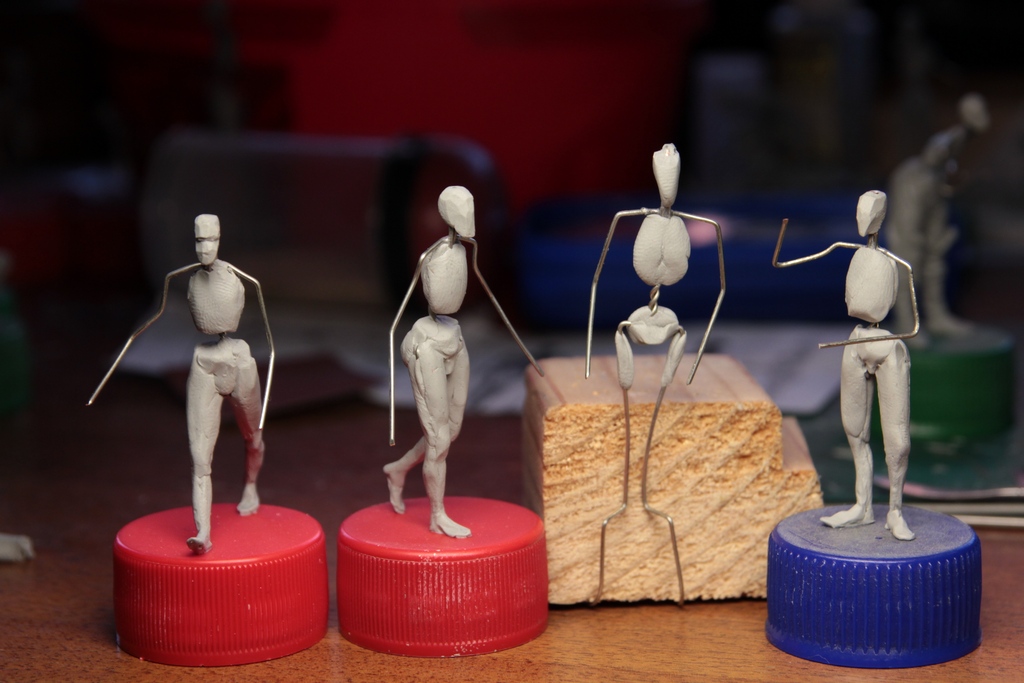 О материалах, используемых для каркаса фигурок сказано уже многое. Проволока, скрепки, отливка из олова и т.д. и т.п. Пробовал облепливать проволочный каркас зелёнкой, пробовал лепить конечности и торс раздельно... Остановился на создании сборного каркаса с использованием заготовок полу-черепа, упрощённых торса и таза.