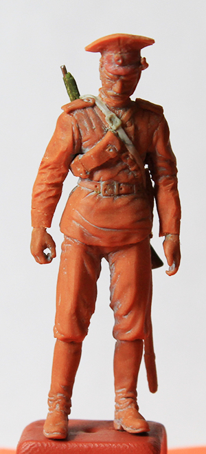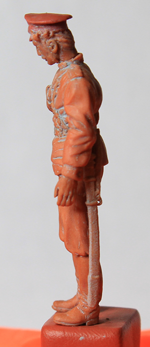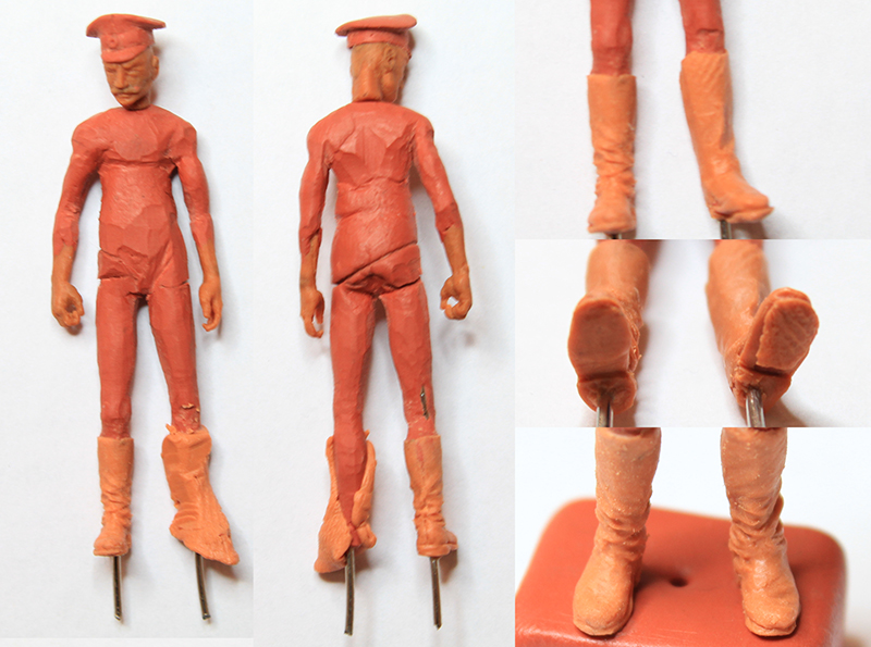 Уважаемые коллеги, спасибо за оценки и внимание к моему скромному труду дилетанта. Сапоги и шаровары закончил. Положение ног пришлось поправить. Слишком кривая была левая нога: не иначе – травма. Добавил объёма торсу. Денис, спасибо за поддержку! Завала фигурки назад-вперёд вроде-бы нет. Посмотрим. Сформировал основные складки (прикидочно), обвесил фигурку временным оружием. Само-собой маузер и точёную из литника временную шашку, являющиеся сейчас габаритно-массовыми макетами, заменю в дальнейшем. После обвеса разметил снаряжение. Для разметки всегда пользуюсь нитками. Так у меня получается точнее. Нитку протягиваю от точки до точки, натягиваю – готово: след ремешка отпечатан. Заготовка гимнастёрки готова, теперь снова: работать, работать…