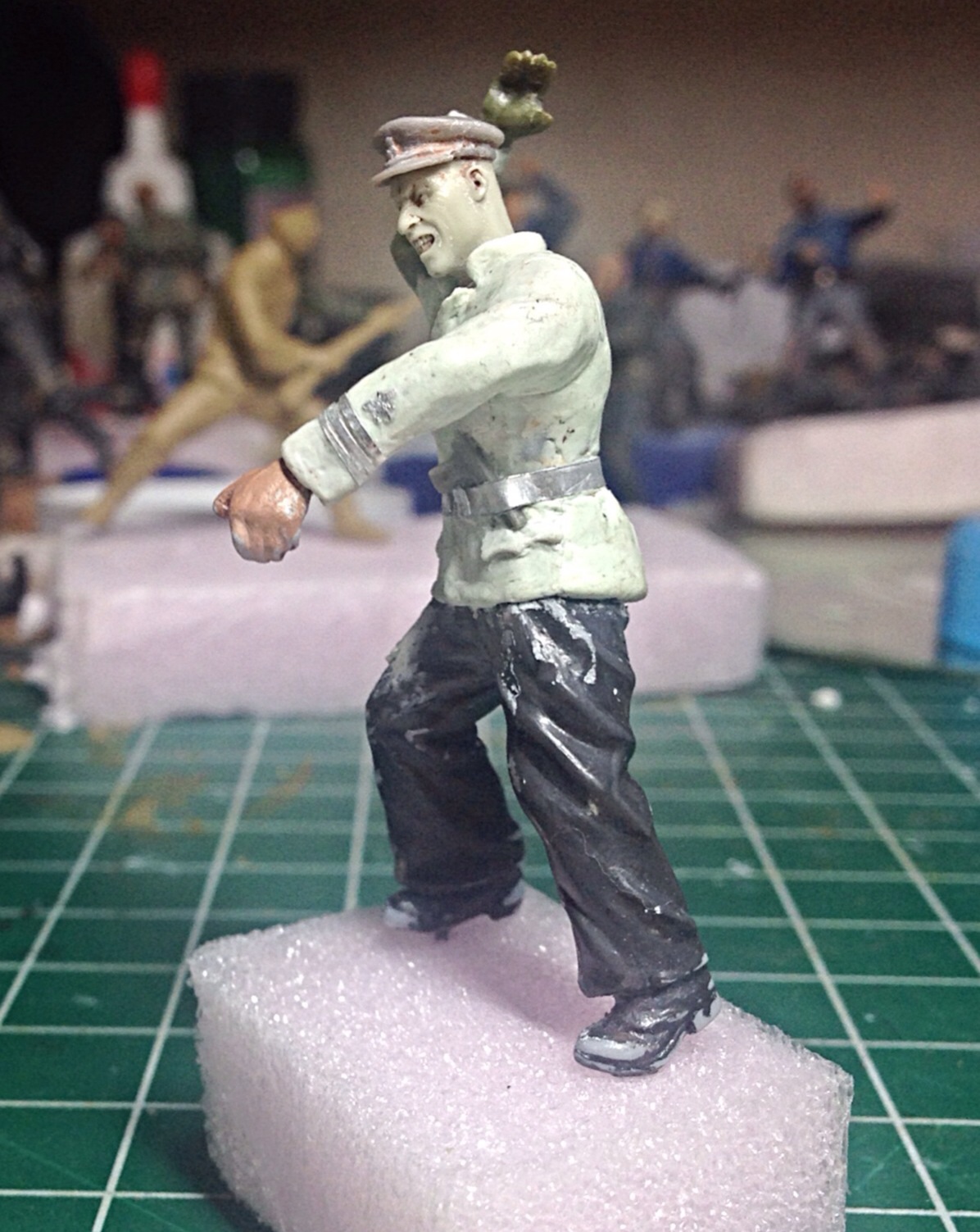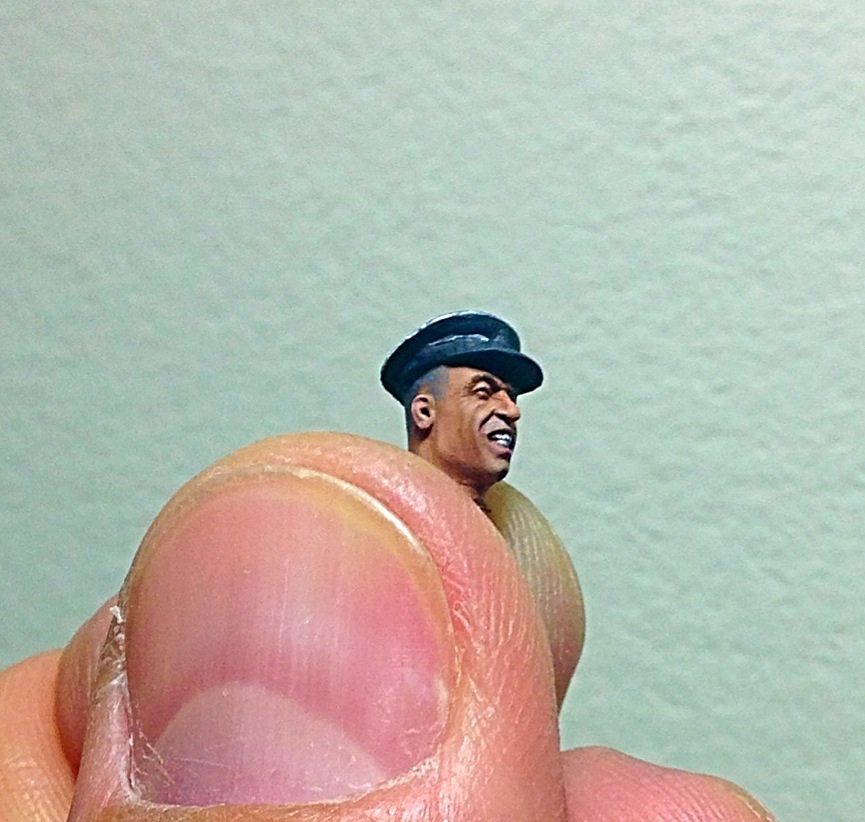 Начал окрас головы у офицера. Пока нравится- оскал такой получается- боевой! Хочу сделать ему "под ноль" прическу. Жиденько развел черный, белый, синий- окрасил виски, затылок.. Вот над этим стоит поработать!