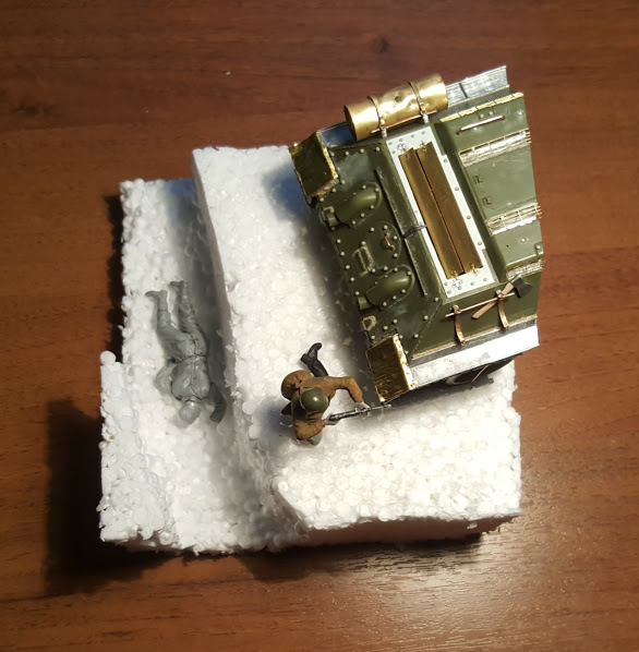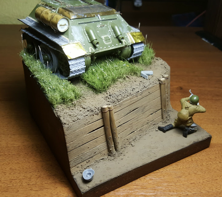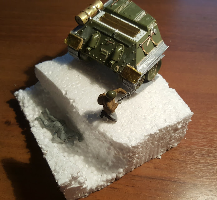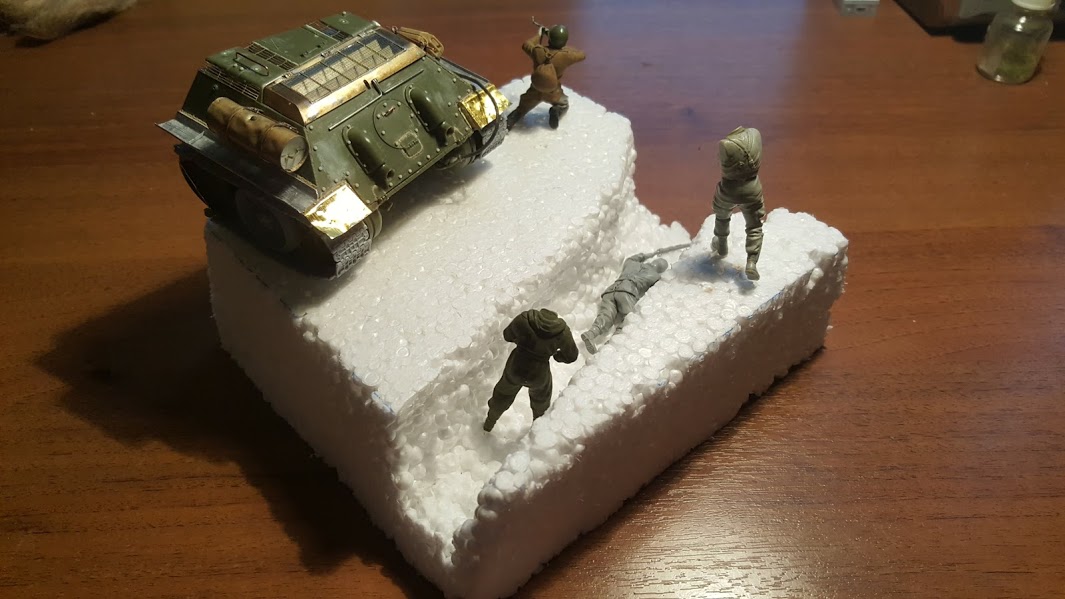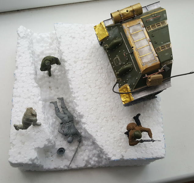СЛАВИК, я бы обрезал часть основания, что справа от танка, там где сейчас у вас сидит боец с ППШ. Его спрятал за броню (кстати, его поза на это и намекает - автоматчик стреляет с колен, спрятавшись за что-то не слишком высокое), туда же к нему бегут и оставшиеся двое. Появится, на мой взгляд, некий сюжет, и композиция станет целостнее. И ещё я бы сделал наклонной ту часть, где корма 34-ки стоит - сейчас у вас плосковато всё смотрится. А рельеф нужно уже на такой стадии формировать: ножиком срезать лишний пенопласт. Грунтом вы сильных изменений не добьётесь.