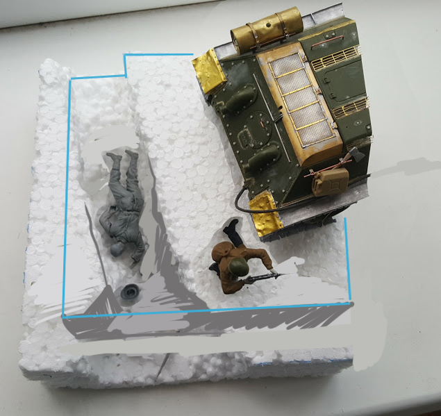 При таком размере танка я бы примерно на столько уменьшил основание, танк подвинул чуть ближе к окопу и оставил пару фигур. Какие именно фигуры - это уже на Ваш выбор,