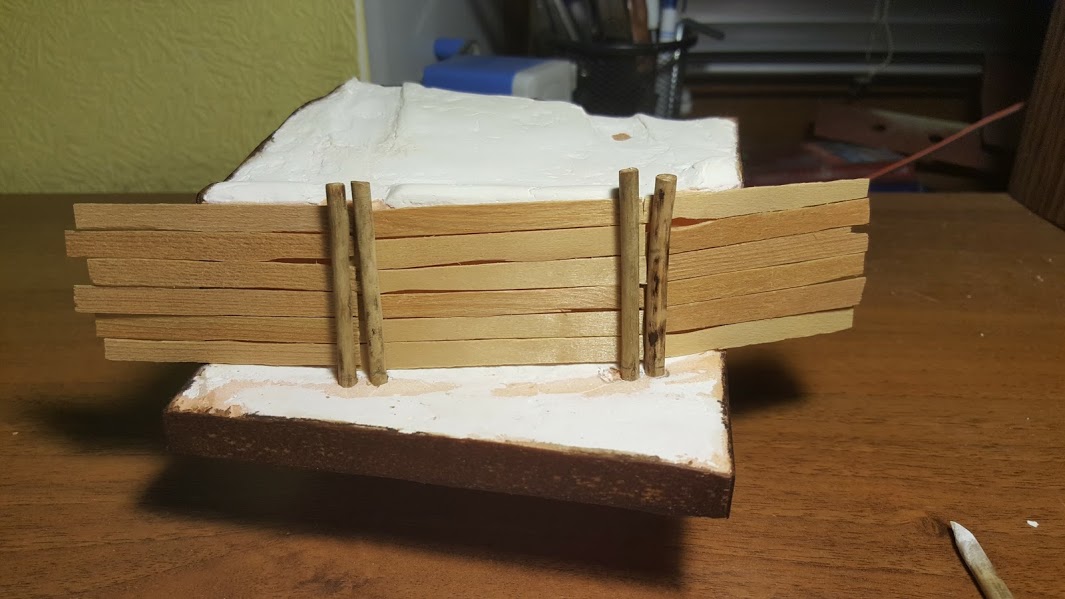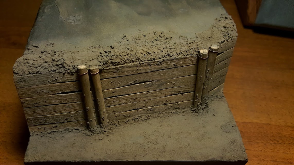 Далее смесью гипса пигментов, и ПВА оформил дно траншеи и бруствер. Тонировал основание и доски только пигментами. По ходу работы будут еще коррективы по цвету.