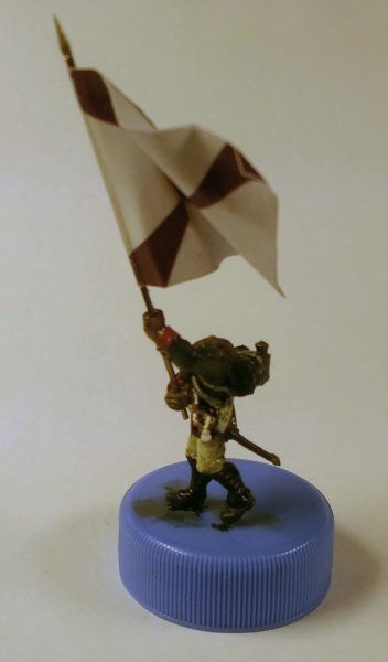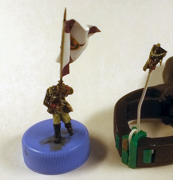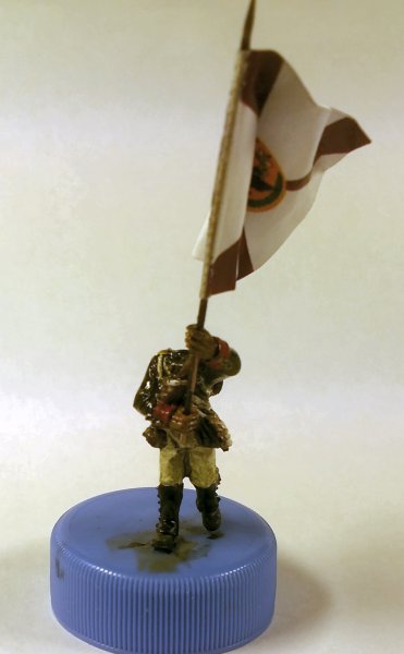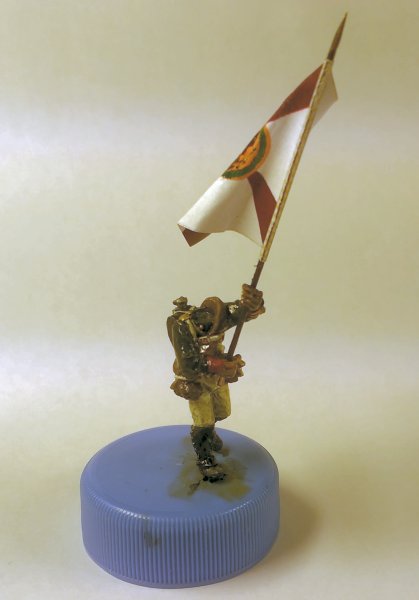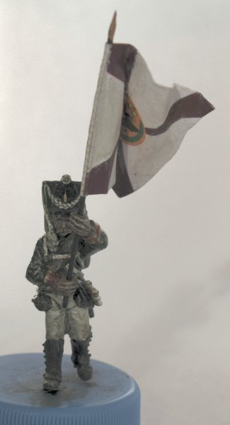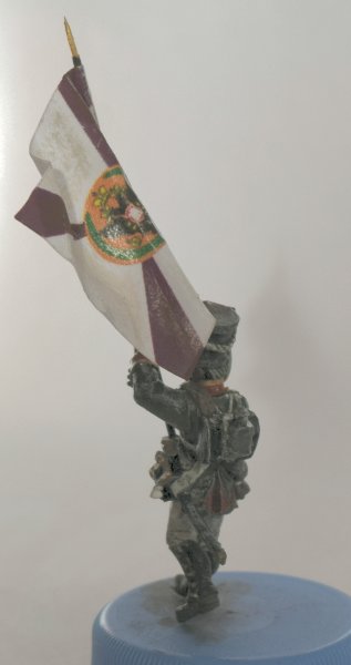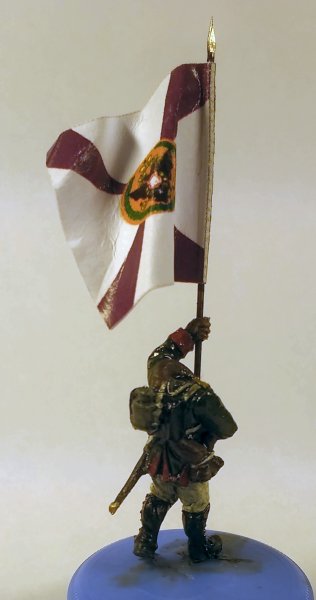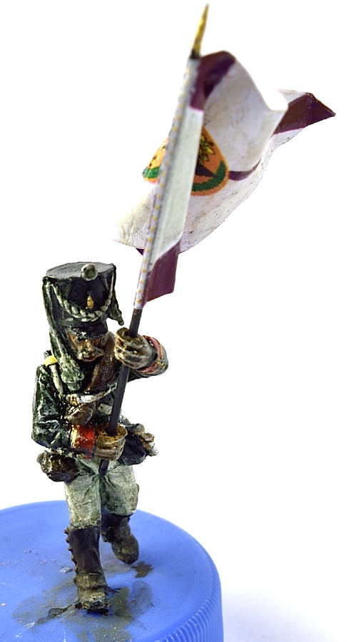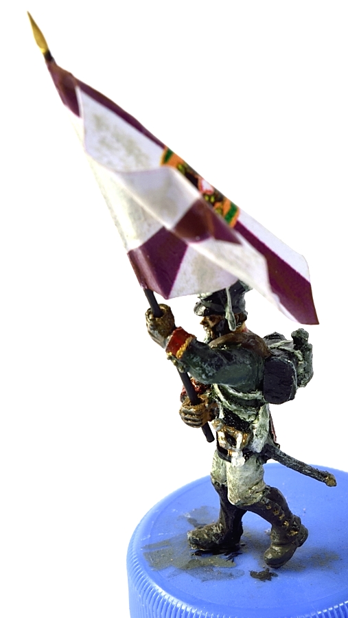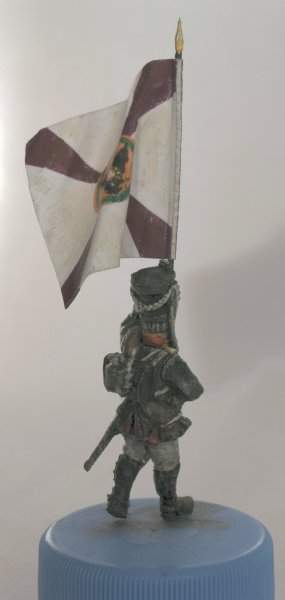 Флаг взял с http://www.vexillographia.ru/russia/rarmy034.htm#pe174 , сделал двухсторонним в фотошопе, распечатал, пропитал сильно разведенным ПВА, и склеил вокруг древка. Сразу отформовал. Потом еще пигментами пройдусь, и задую матовым лаком, а то мой цветной лазерник дает очень сильный глянец при печати. Флаг - "белый" полковой флаг обр. 1797 года уфимского полка. Второй флаг будет обычный того же полка.