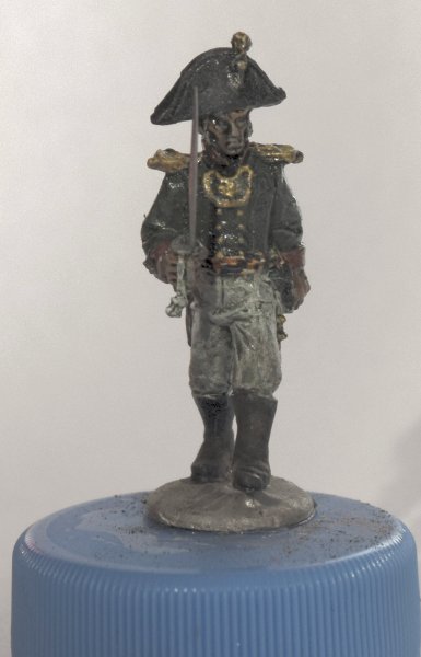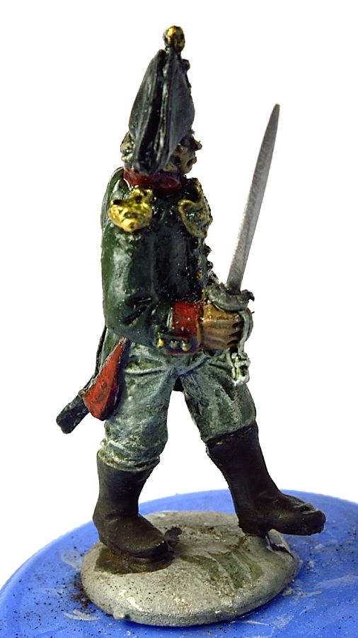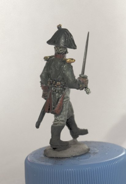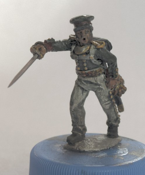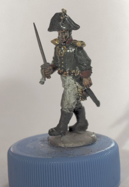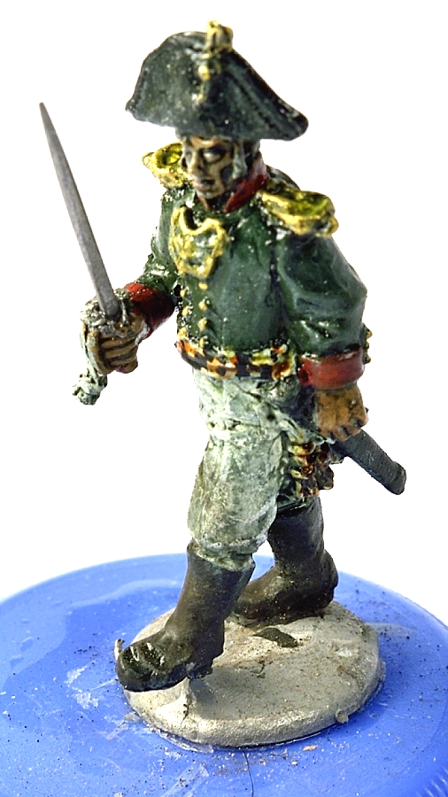Вчера и сегодня красил пару офицеров. В шляпе - капитан от Варлорд, в фуражке - подпоручик от Перри. Знаменосец - состарено знамя, доделан золотой галун на воротник. Клинки заменены на выточеные из твердой стали при помощи проксона и алмазного диска. Еще будет матовый лак, пока что еще после масла блестит.
