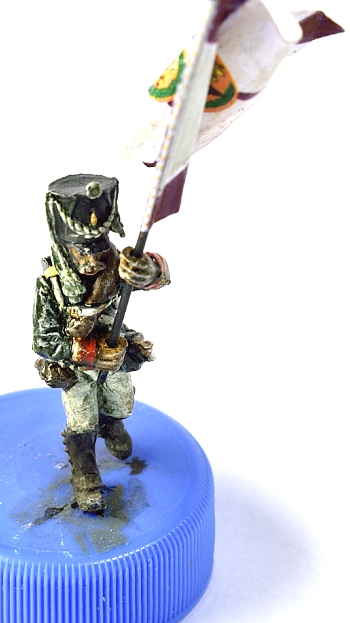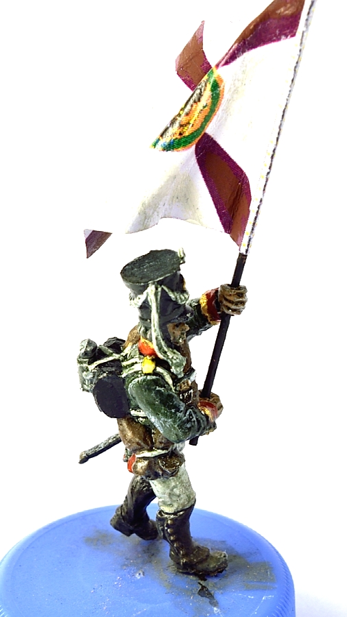 Вчера вечером начал окраску первой фигуры, решил начать со знаменосца из Варлордовского набора русской пехоты. Пехотинцы там пластик, а офицер, барабанщик и знаменосец - металлические. Качество отливки хорошее, надо было лишь убрать еле заметный шов и сточить ножны тесака.