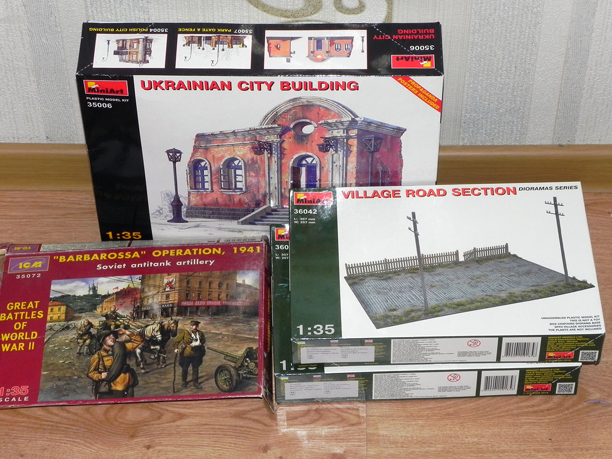 Есть старый набор ICM с "сорокопяткой" на конной тяге, есть здание и два набора мостовых от Миниарта. Есть ещё много всяких мелочей типа столбов, заборов, ворот, кирпичей и .д. Из всего этого хочу сделать композицию с рабочим названием "Тяжёлое лето 1941го". Думаю, сюжет понятен. Есть ещё идея добавить "изюминку". Но об этом позже.