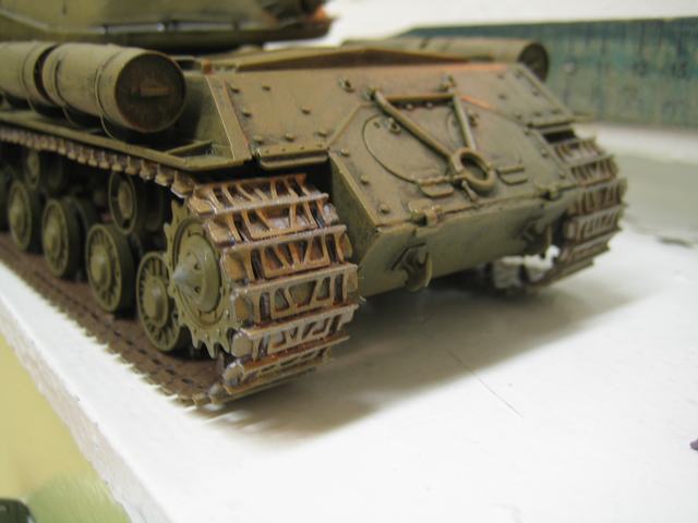 И общее замечание по гусеницам. При движении танка все выступающие участки траков обдираются до блеска. Поэтому надо было методом "сухой кисти" пройтись по гусеницам стальным цветом (не путать с алюминием!). Операция простенькая, а эффект - потрясающий!