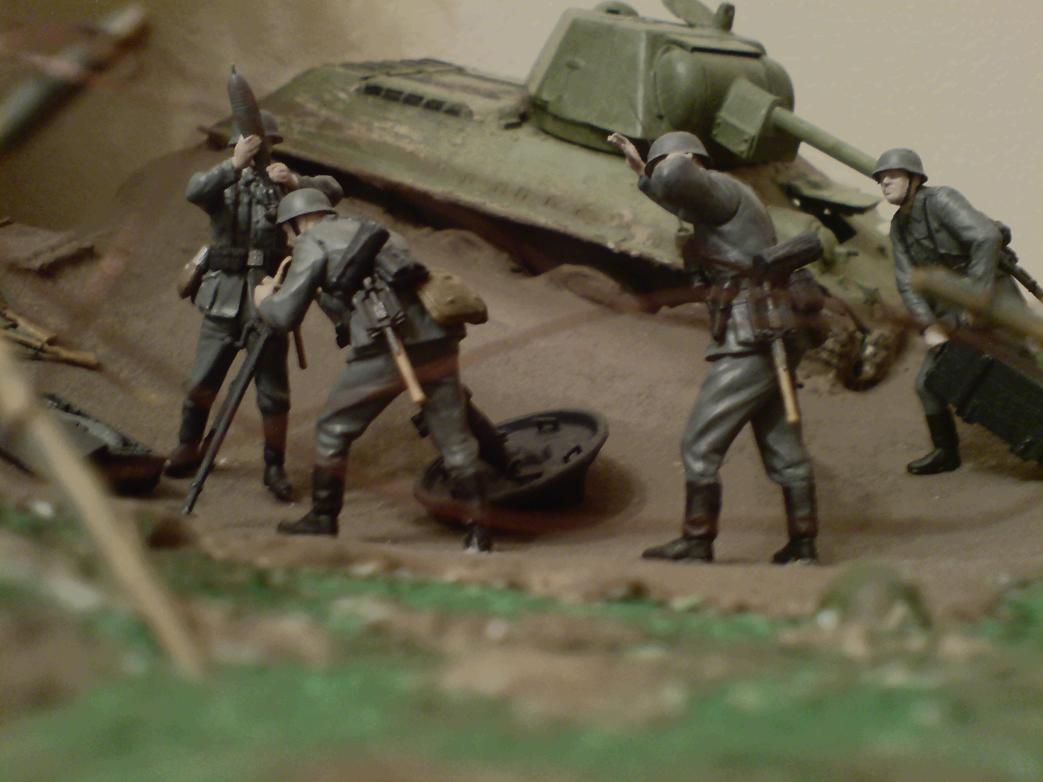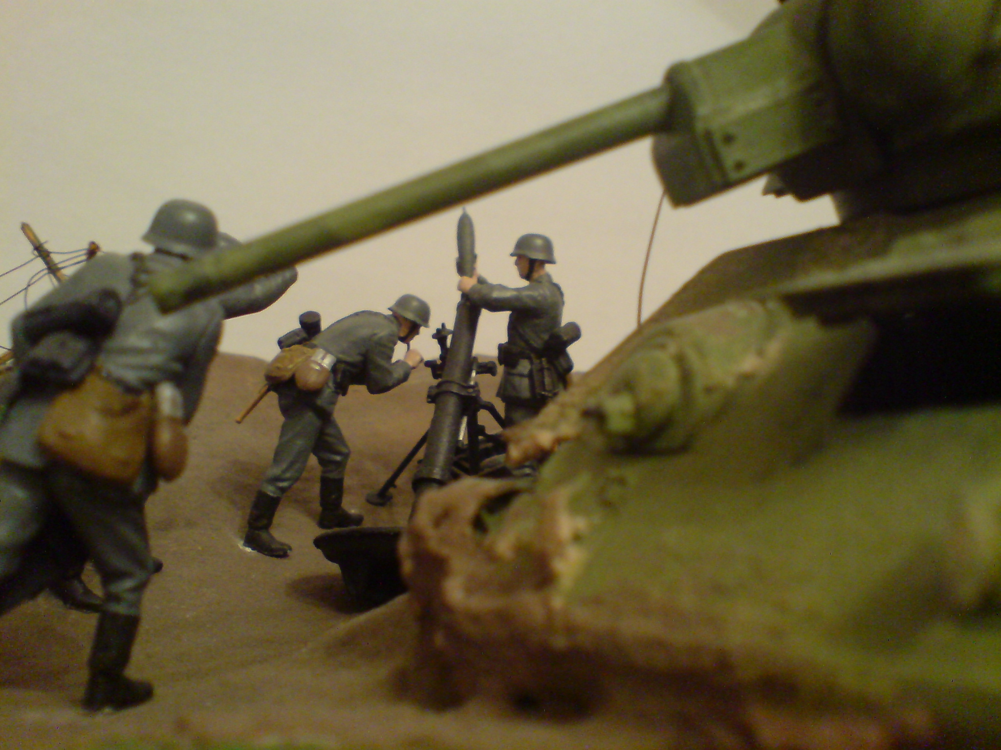 Это моя 1диорама ;подбитый т34/76 и "Немецкий миномет с расчетом" от "Звезды" ; сделал по фотографии из "Энциклопедии военной техники"