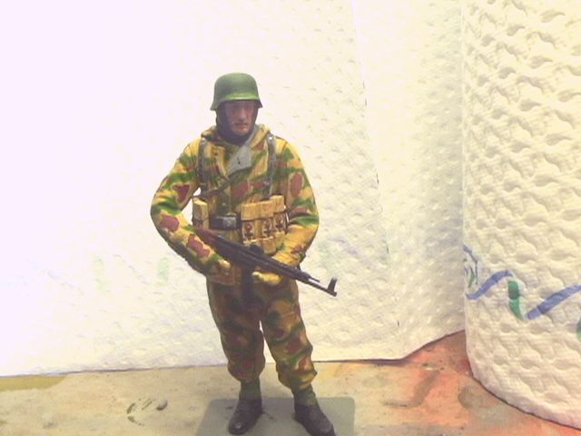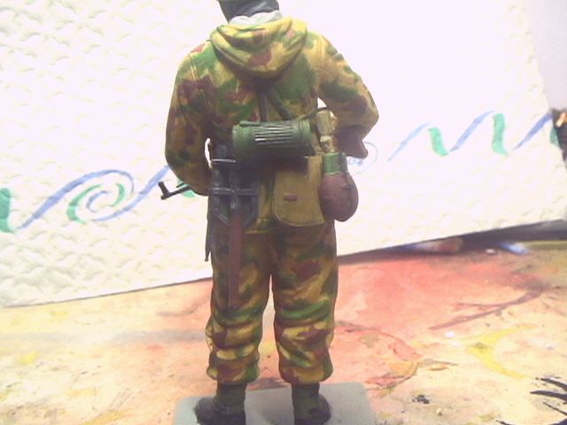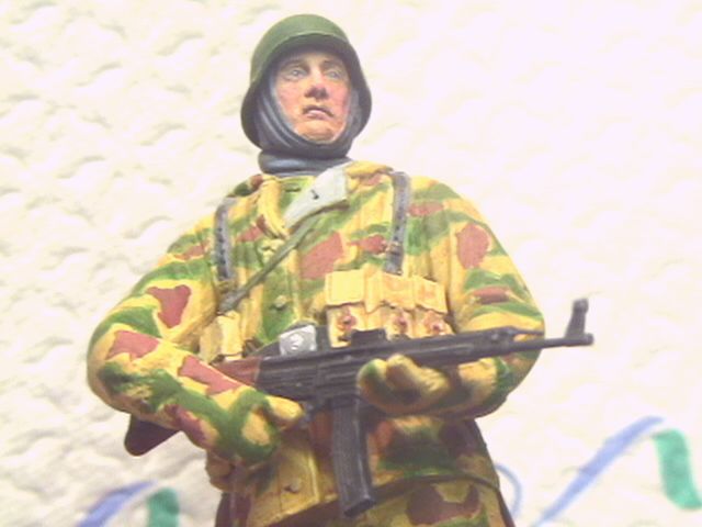 Вы там тени вообще-то выделяли или я просто ничего не вижу? Пятна камуфляжа не высветлены, складки не показаны. Насколько мне известно в 1/16 масштабе это вполне возможно сделать. Хотя Тамиевская фигура это смола и не метал, но все же. Я так понимаю, это еще не законченая работа?