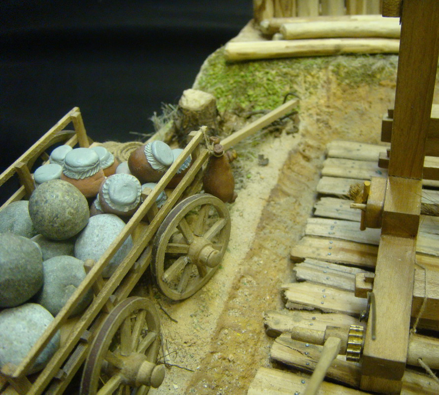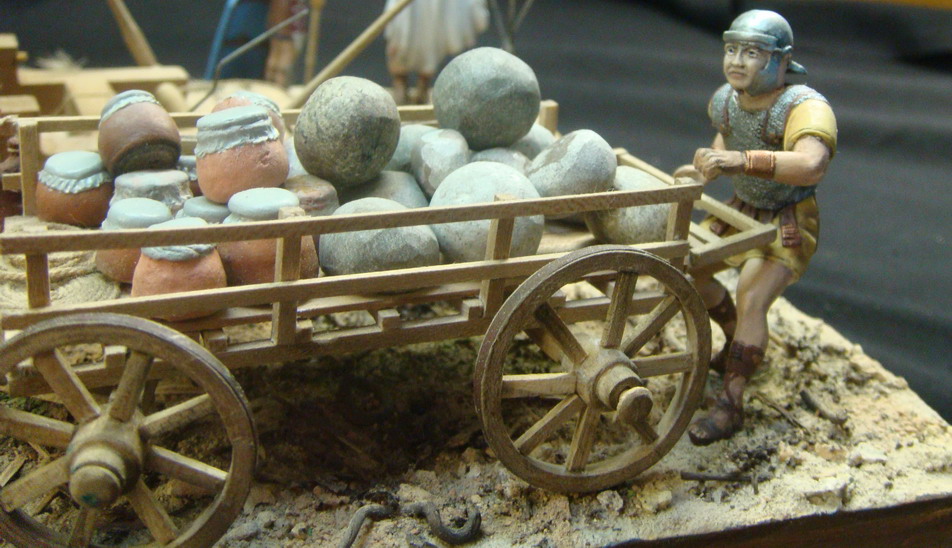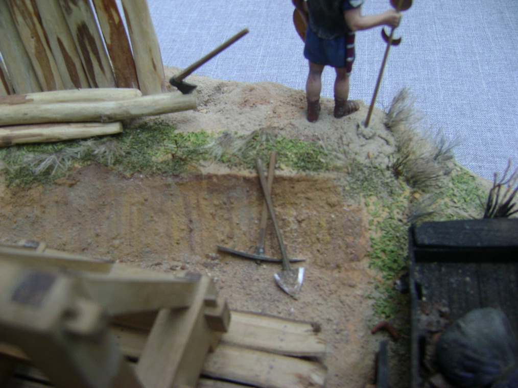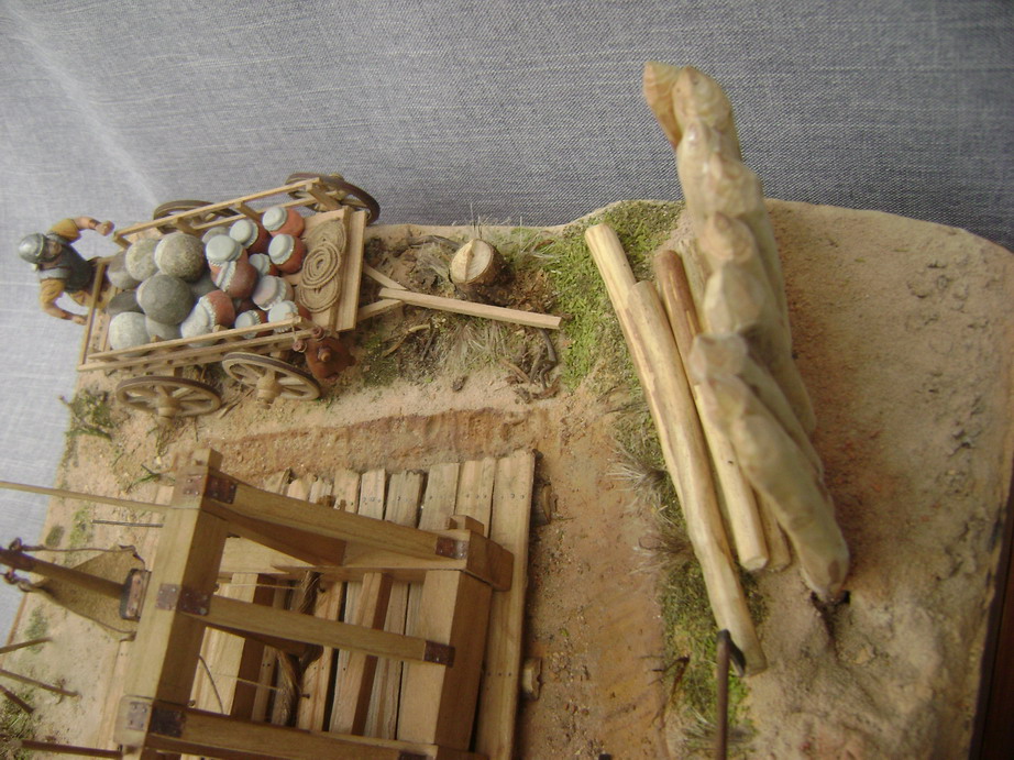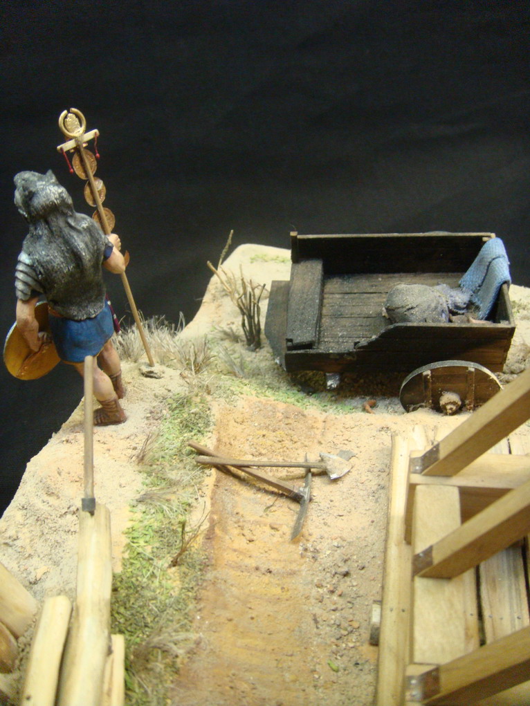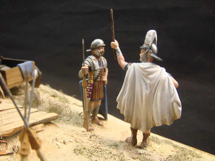 Выглядел он одиноко и я решился на небольшую миниатюру.Фигур подходящих не нашлось,решили реанимировать набор римлян Донецкого завода игрушек.С помощью милипута переделал шлемы,наплечники,оружие и вообще одежду.Сделали римскую телегу и брошенную дакийскую.Основание из фанеры задули строительной монтажной пеной, обработали ножом и наждачкой, создали рельеф. Зашпатлевали опять таки строительной готовой акриловой шпатлевкой. Гуашью придали нужный оттенок. Для грунта взяли песок, молотый кирпич, землю, старую перегоревшую штукатурку двух цветов,получилось пять оттенков грунта. Трава из пакли, мха,сушенного укропа и крашенных опилок, куст из веника.