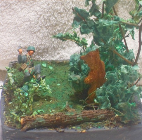 Хотел бы представить результат своего первого диорамостроения.Немецкий десатник пробираясь по лесу натыкается на Хозяина и, есстественно, пугается.Немец из набора ЗВЕЗДЫ подвергся переработке: правая нога и руки от другого десантника из этого же набора.Деревья сделаны из веточек какого-то кустарника, трава- сантехнический лён. Листья из окрашеной бумаги. Медведь самолепный из массы ДЖОВИ. Основание- папье маше.